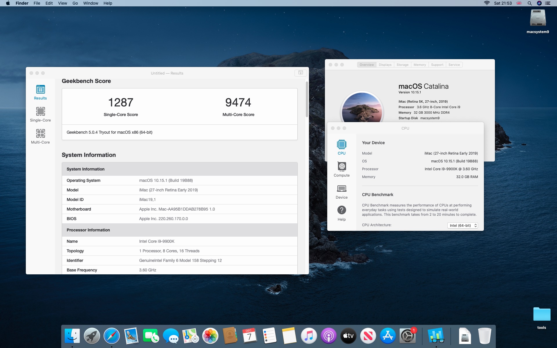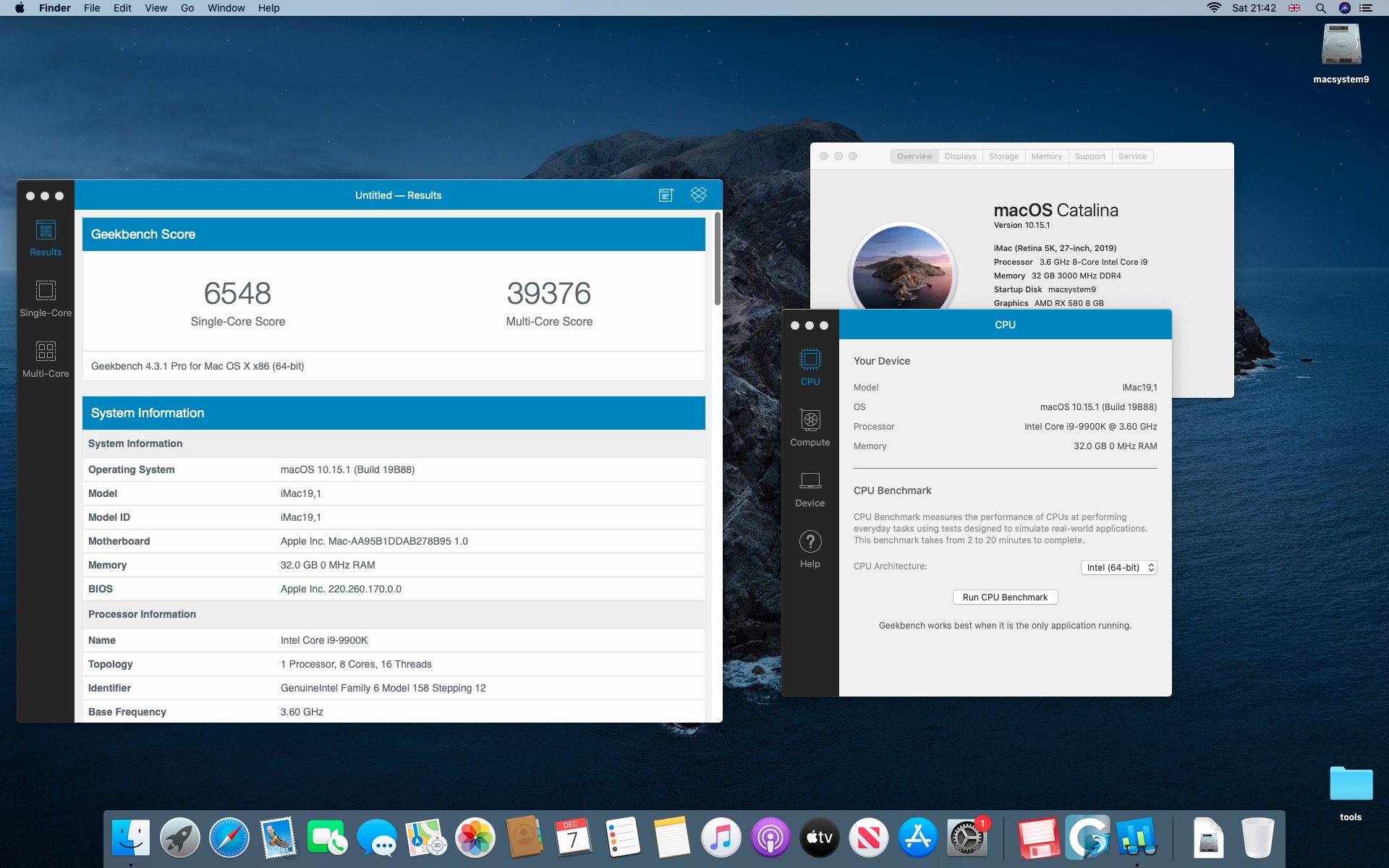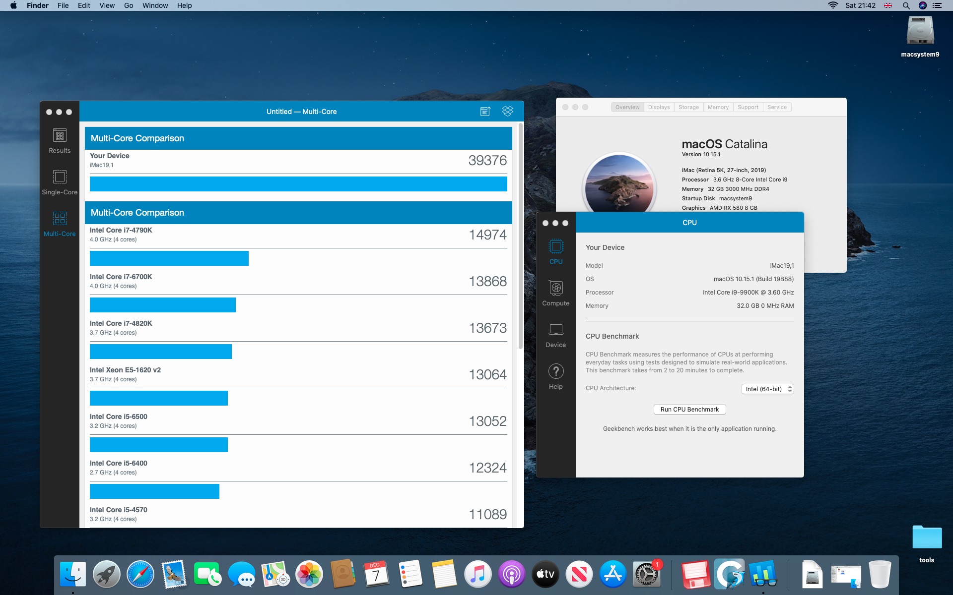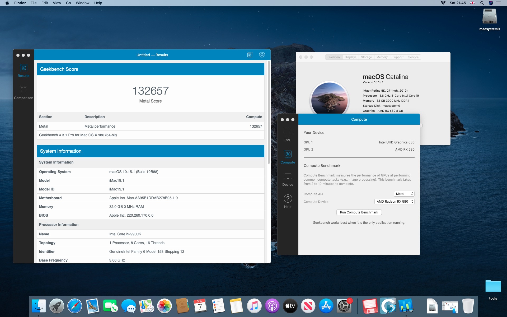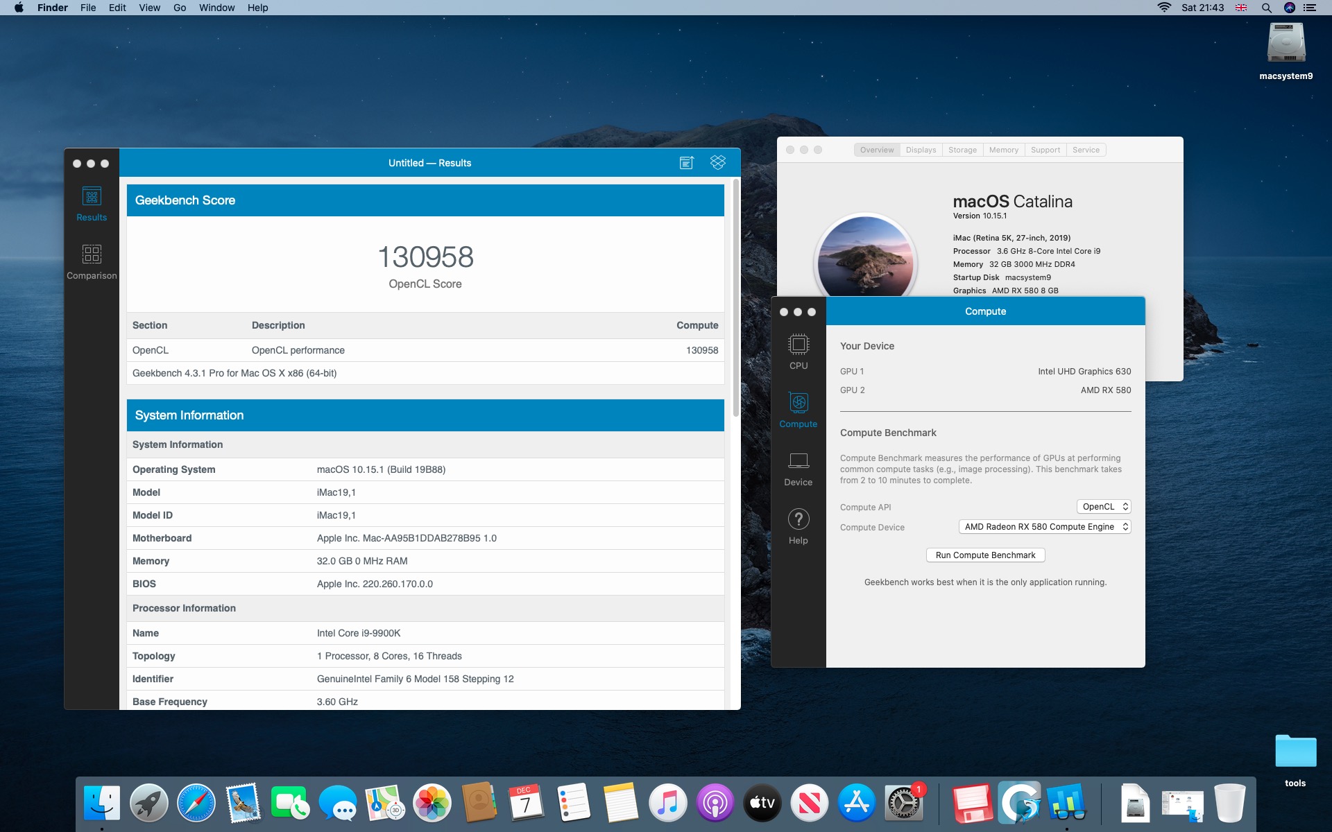 Testy komputera Macstorm V. Procesor Intel Core i9-9900K 3.6@5.0 GHz.System Catalina 10.15.1. Grafika Radeon RX 580 8 GB. Pamięć 32 GB DDR4 3000 MHz.
