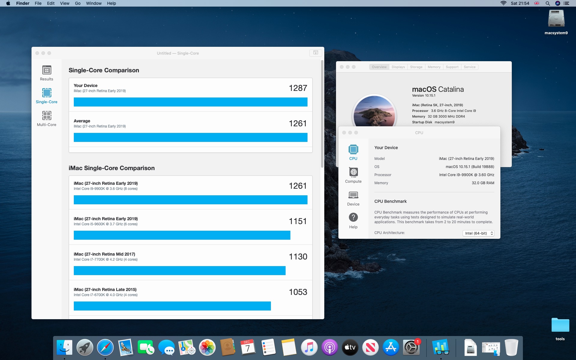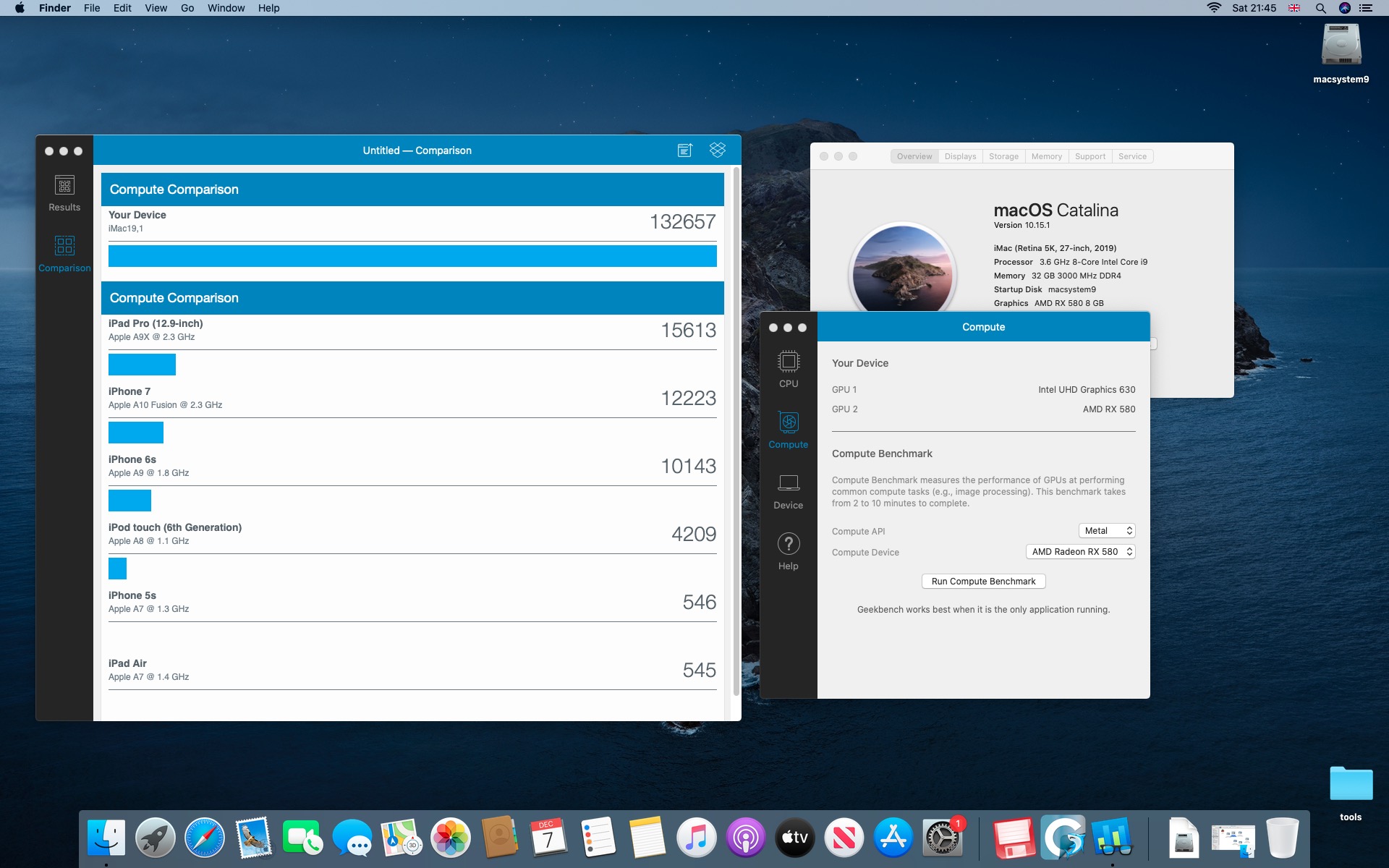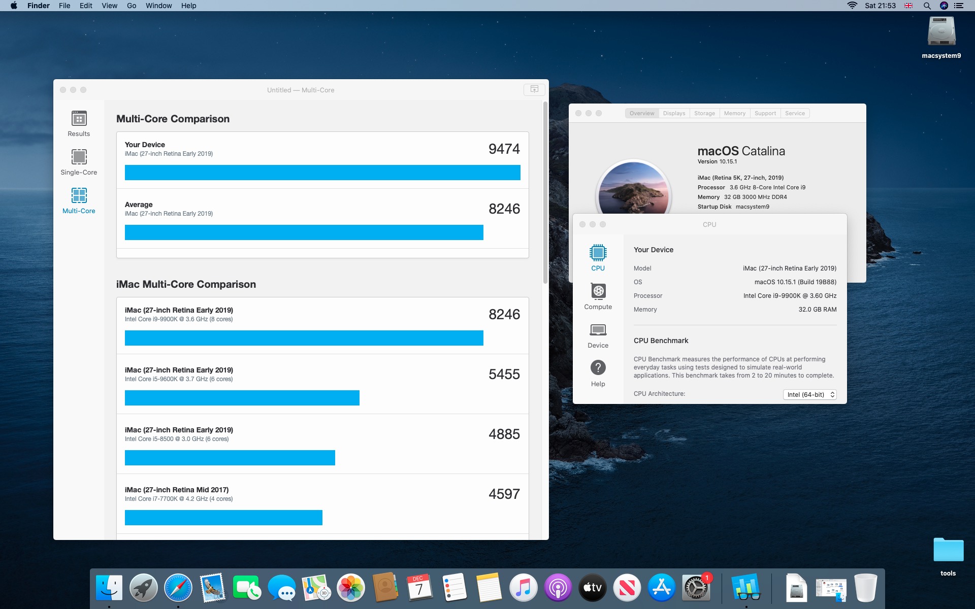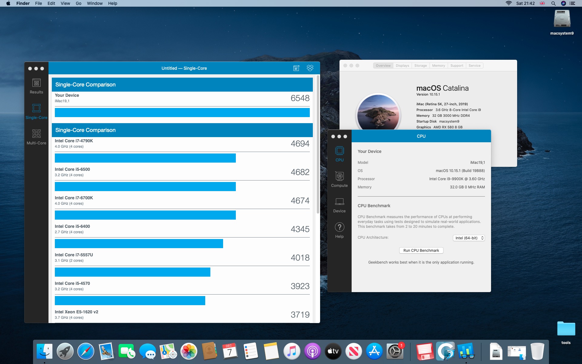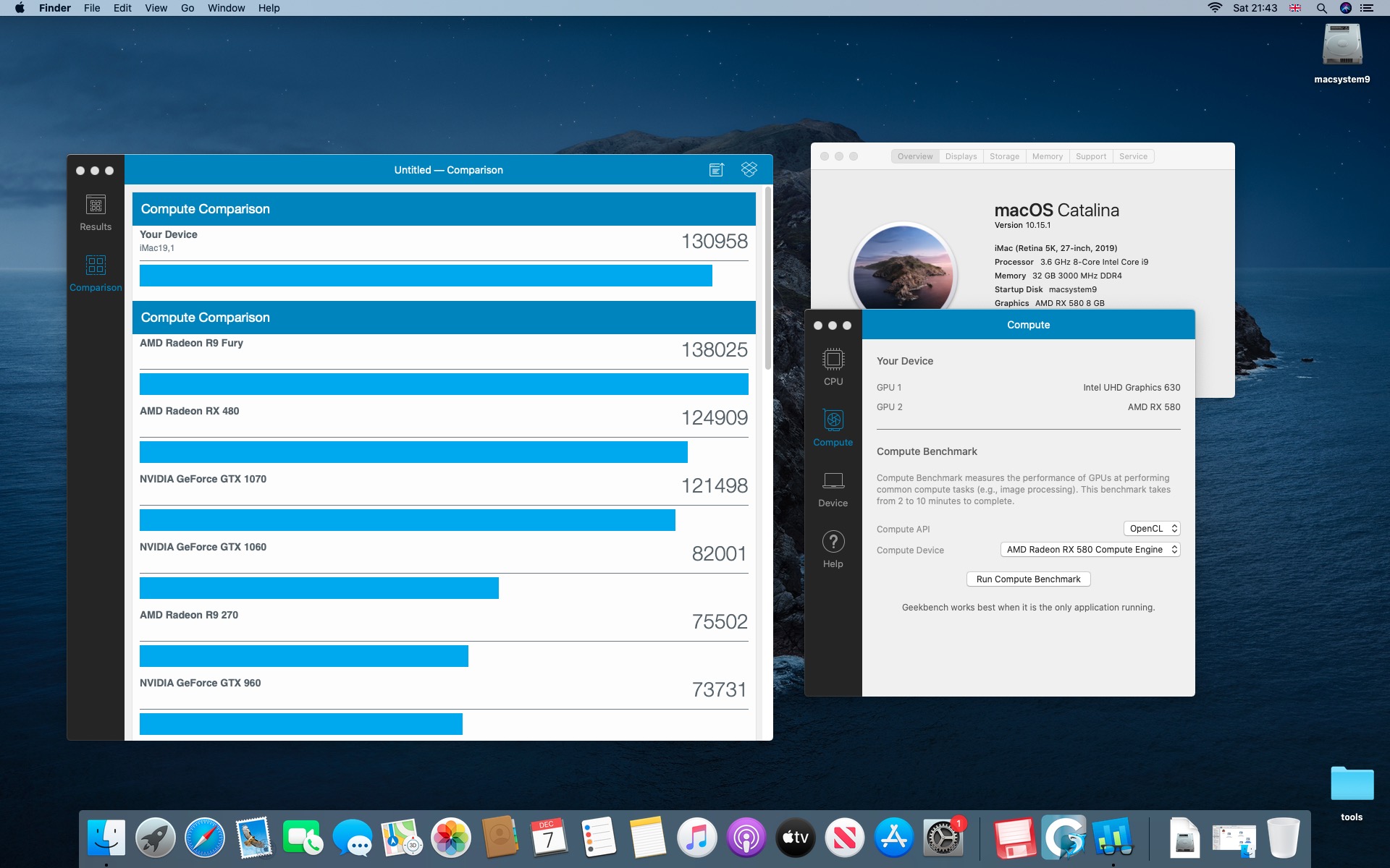 Testy komputera Macstorm V. Procesor Intel Core i9-9900K 3.6@5.0 GHz.System Catalina 10.15.1. Grafika Radeon RX 580 8 GB. Pamięć 32 GB DDR4 3000 MHz.