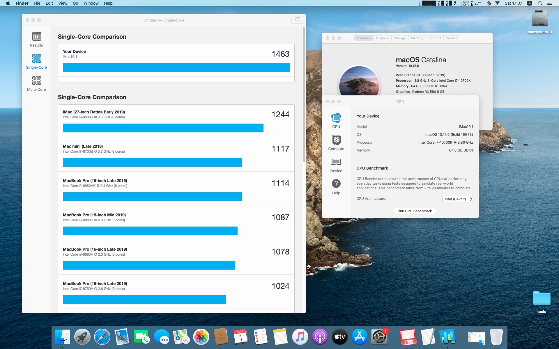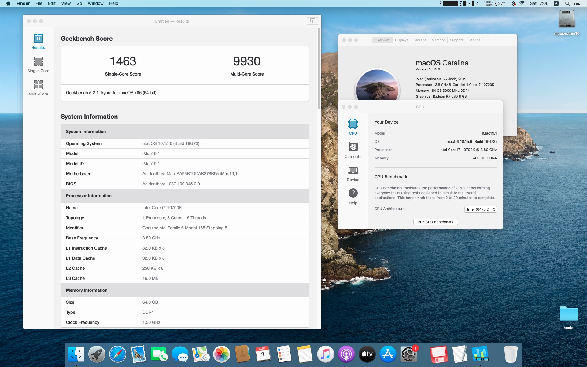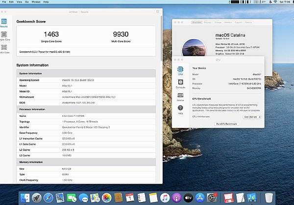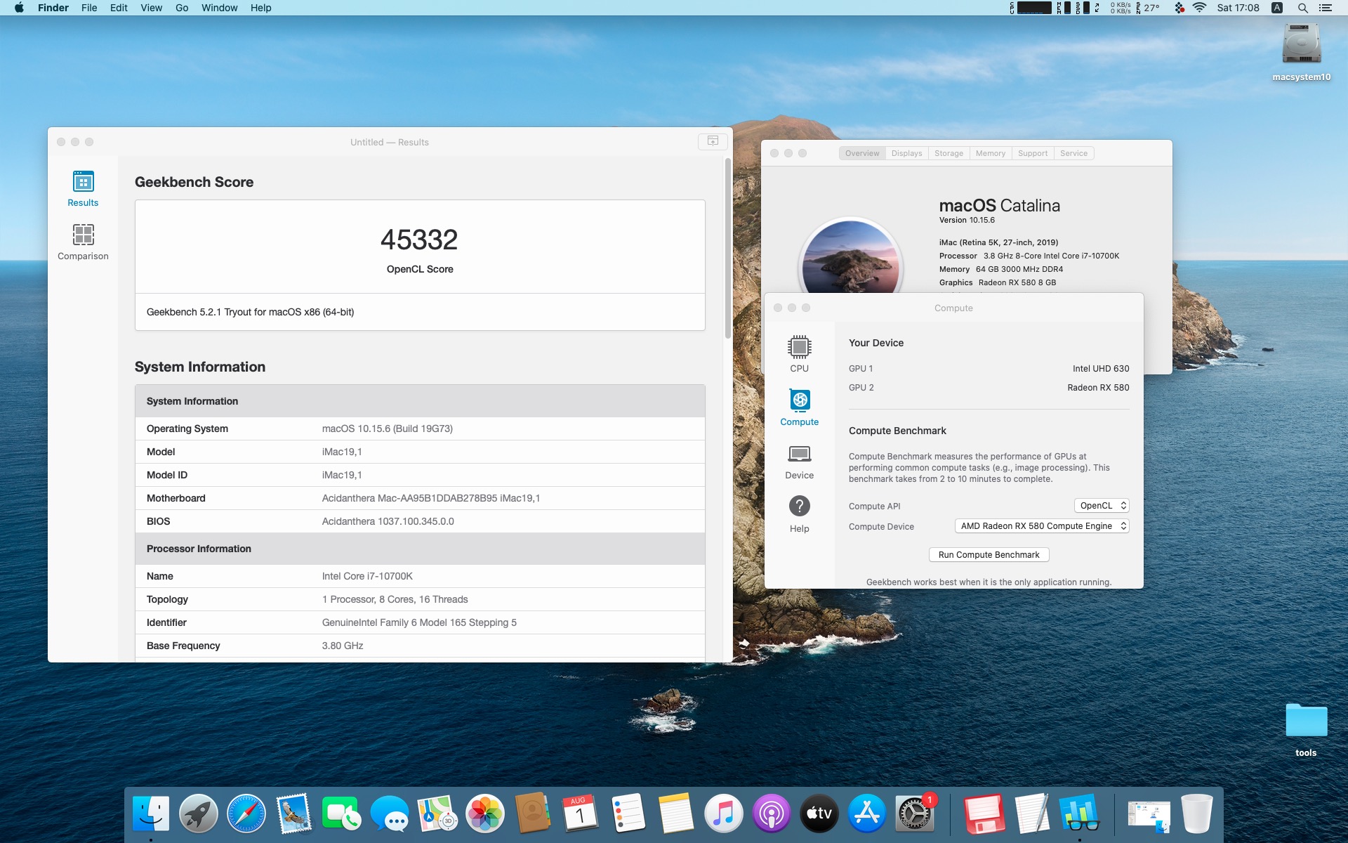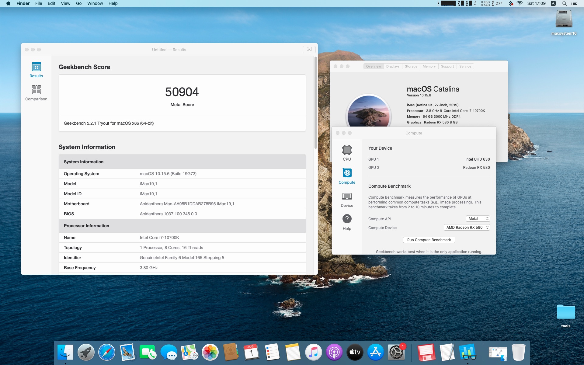 MacOS Catalina 10.15.6 . Procesor Intel Core i7-10700K 3.8@5.2 GHzKarta graficzna Radeon RX 580 8 GB. Pamięć 64 GB DDR 3000 MHz.