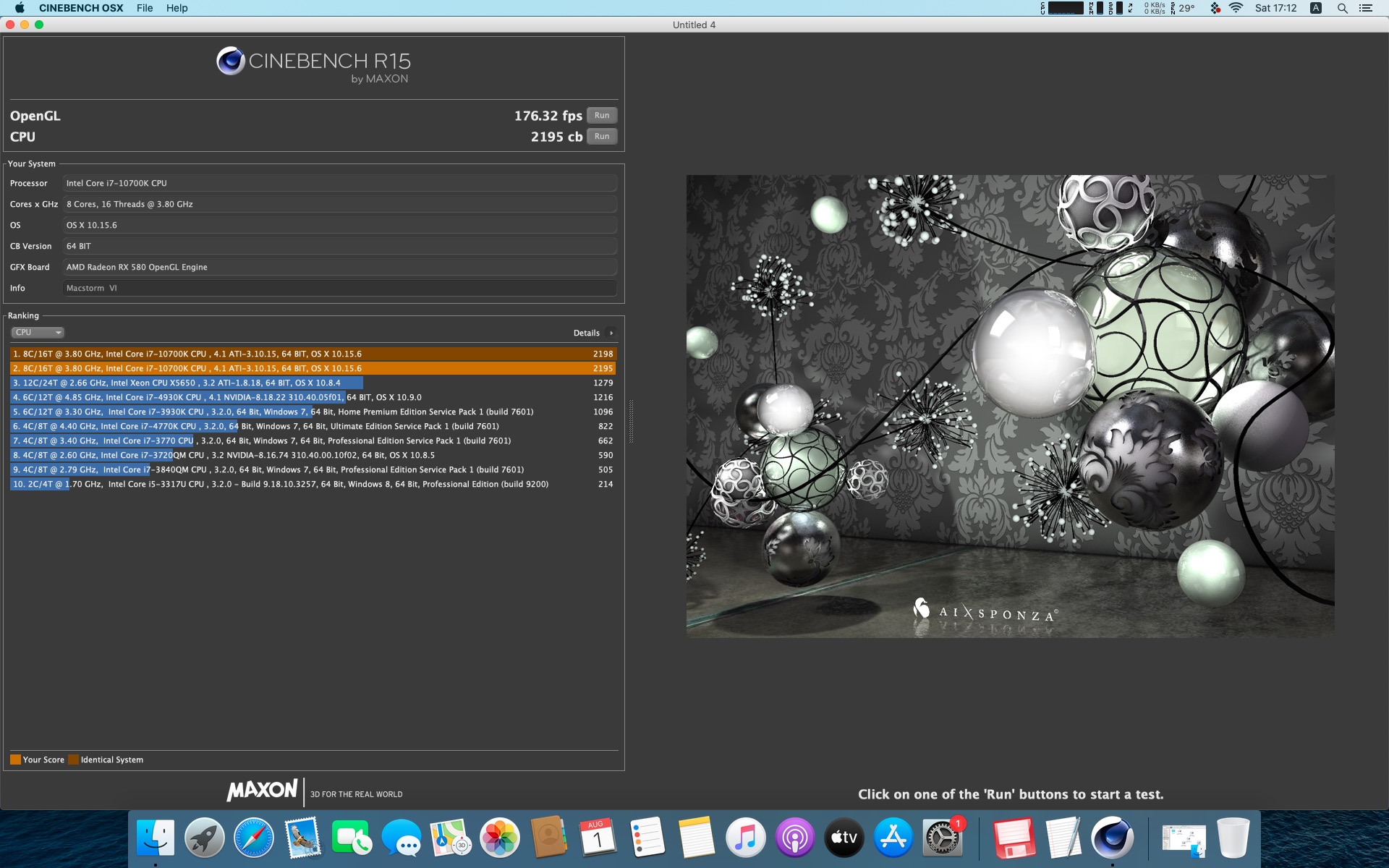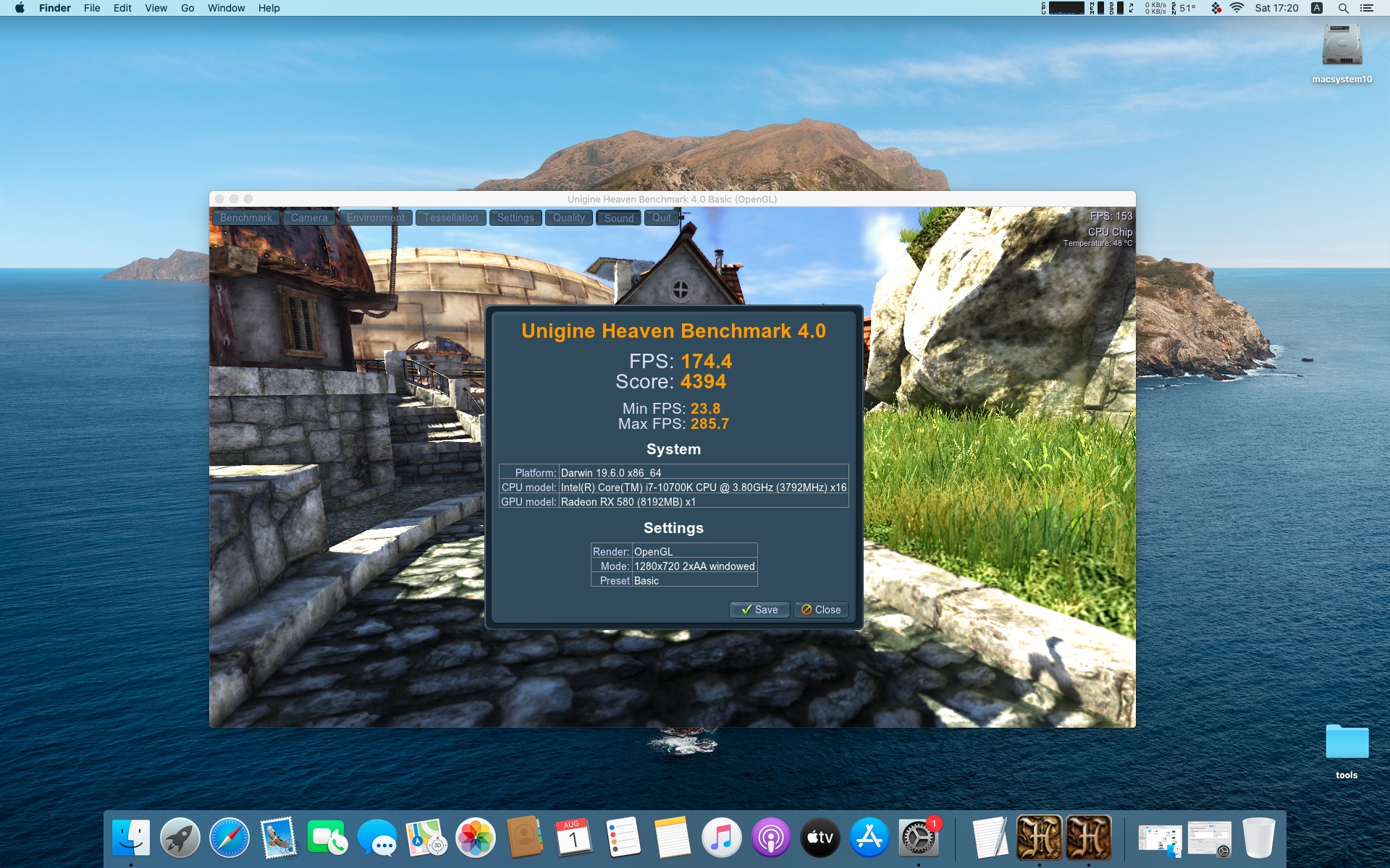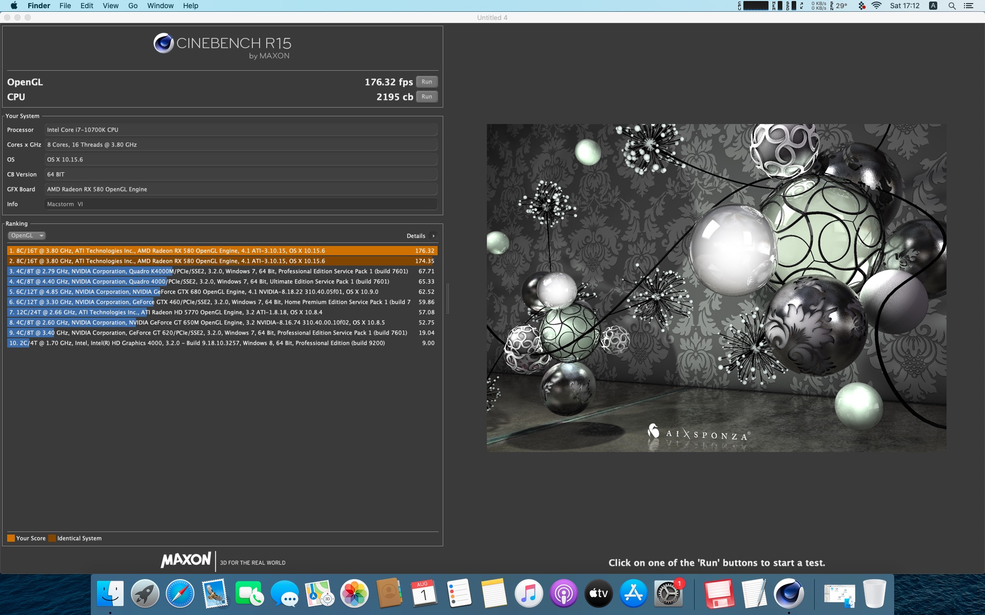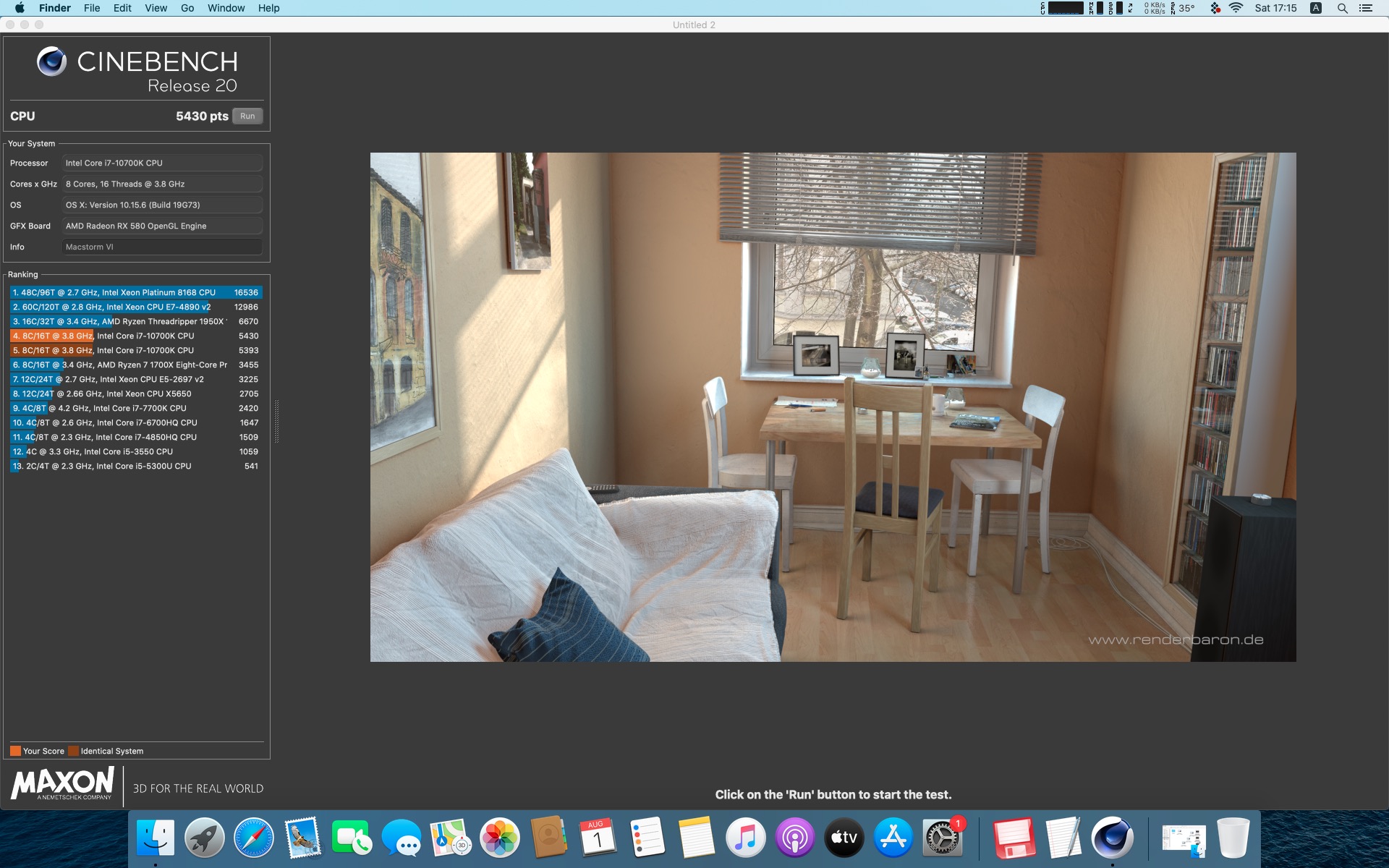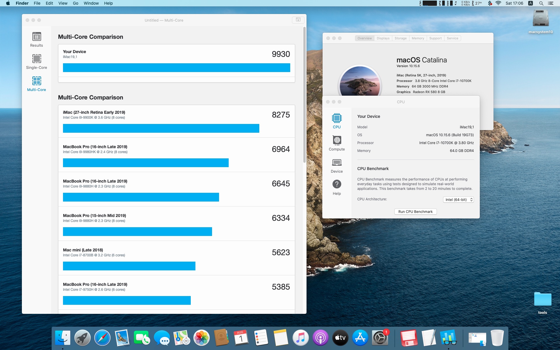 MacOS Catalina 10.15.6 . Procesor Intel Core i7-10700K 3.8@5.2 GHzKarta graficzna Radeon RX 580 8 GB. Pamięć 64 GB DDR 3000 MHz.