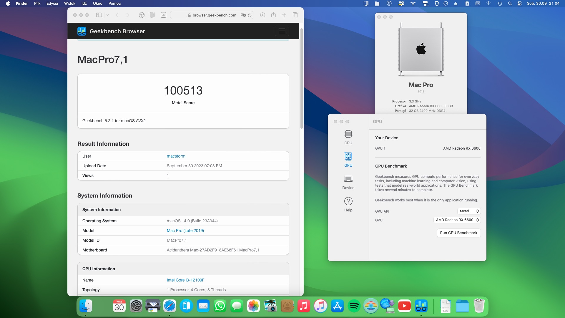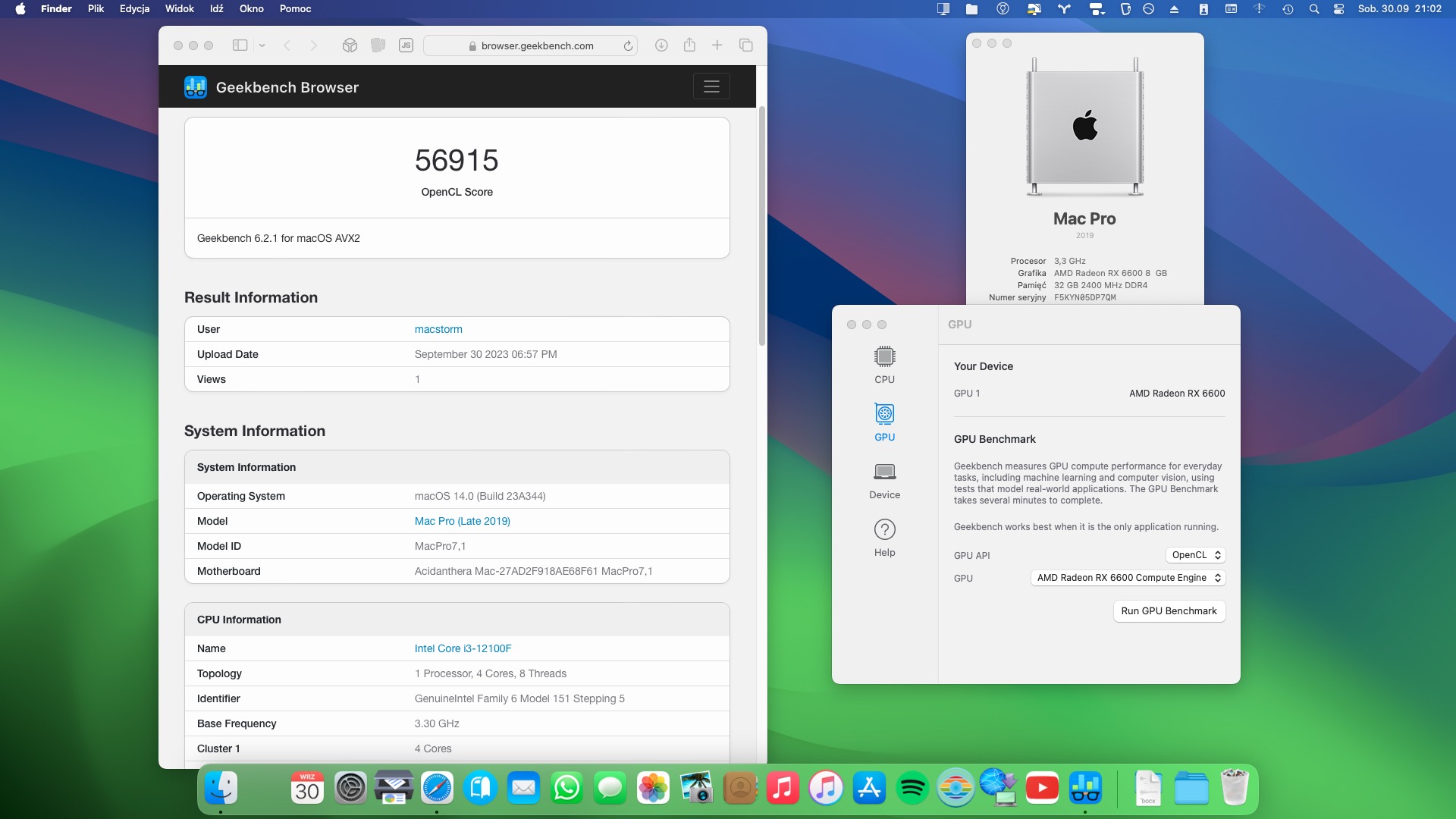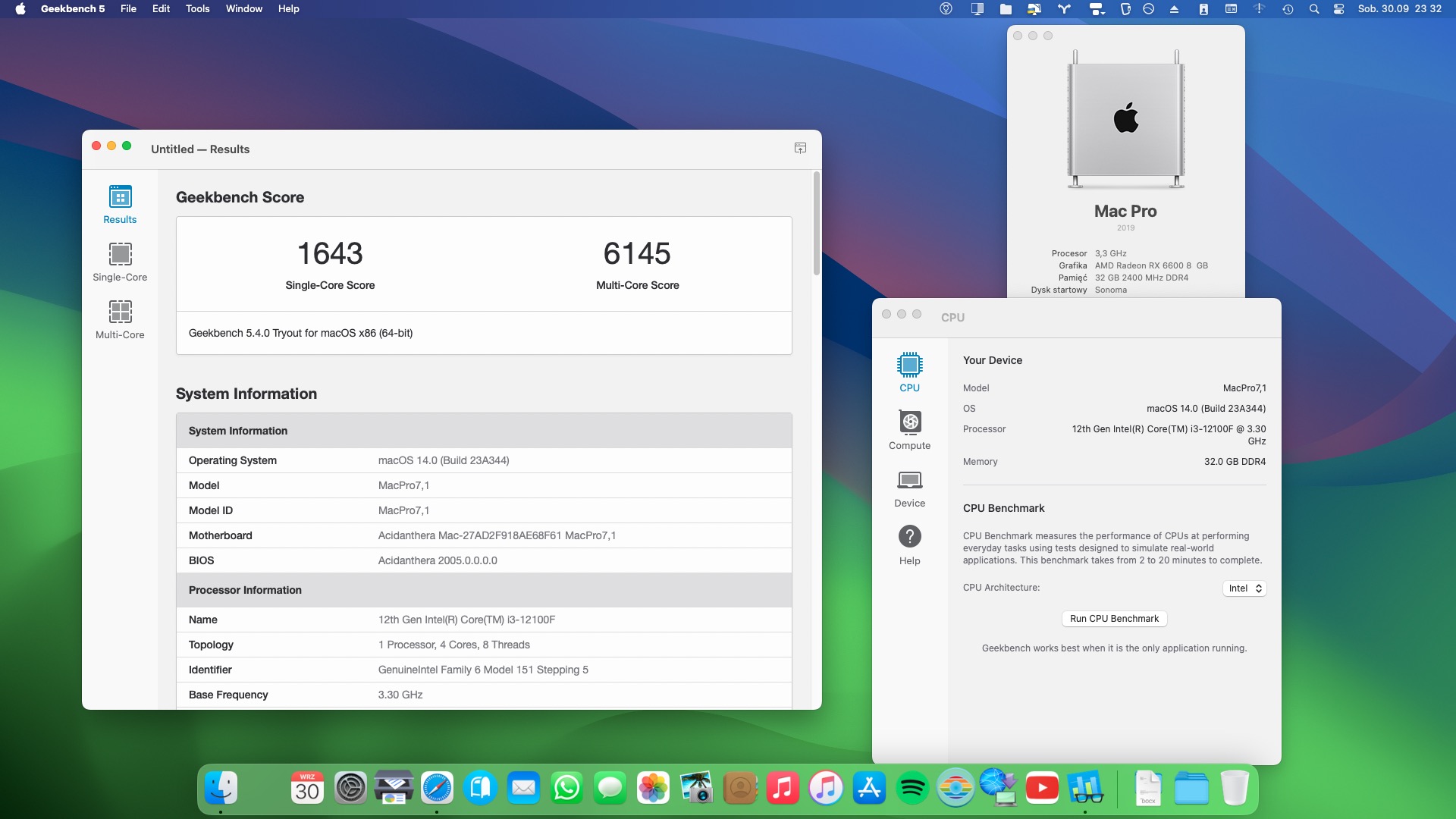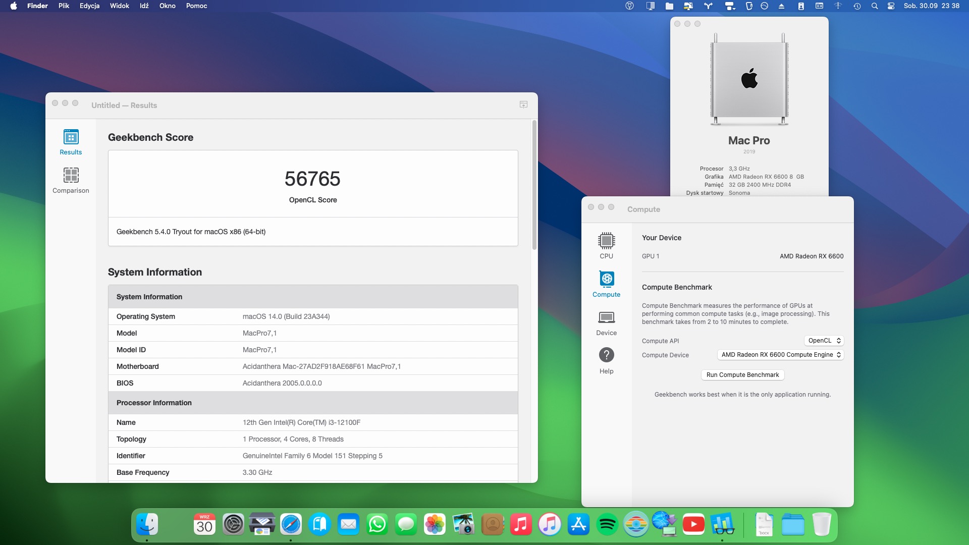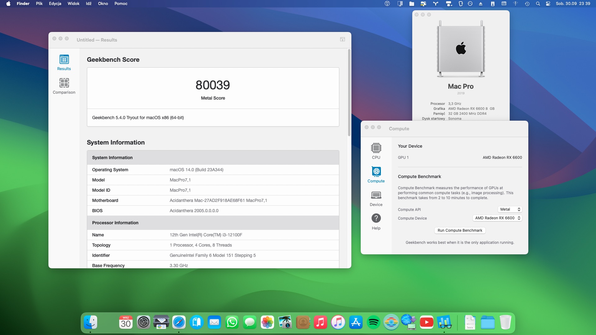 macOS Sonoma 14.0 . Procesor Intel Core i3-12100 3.3 GHz .Pamięć 32 GB DDR4 2400 MHz.Karta graficzna Radeon RX 6600 8 GB.