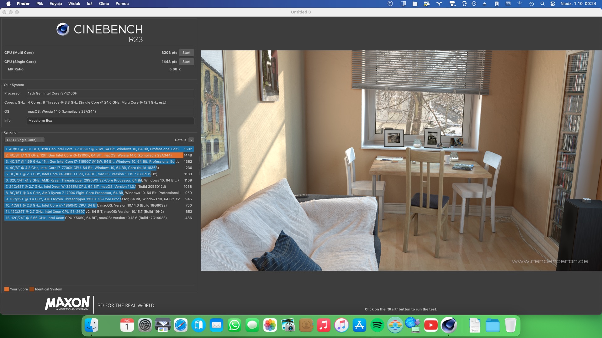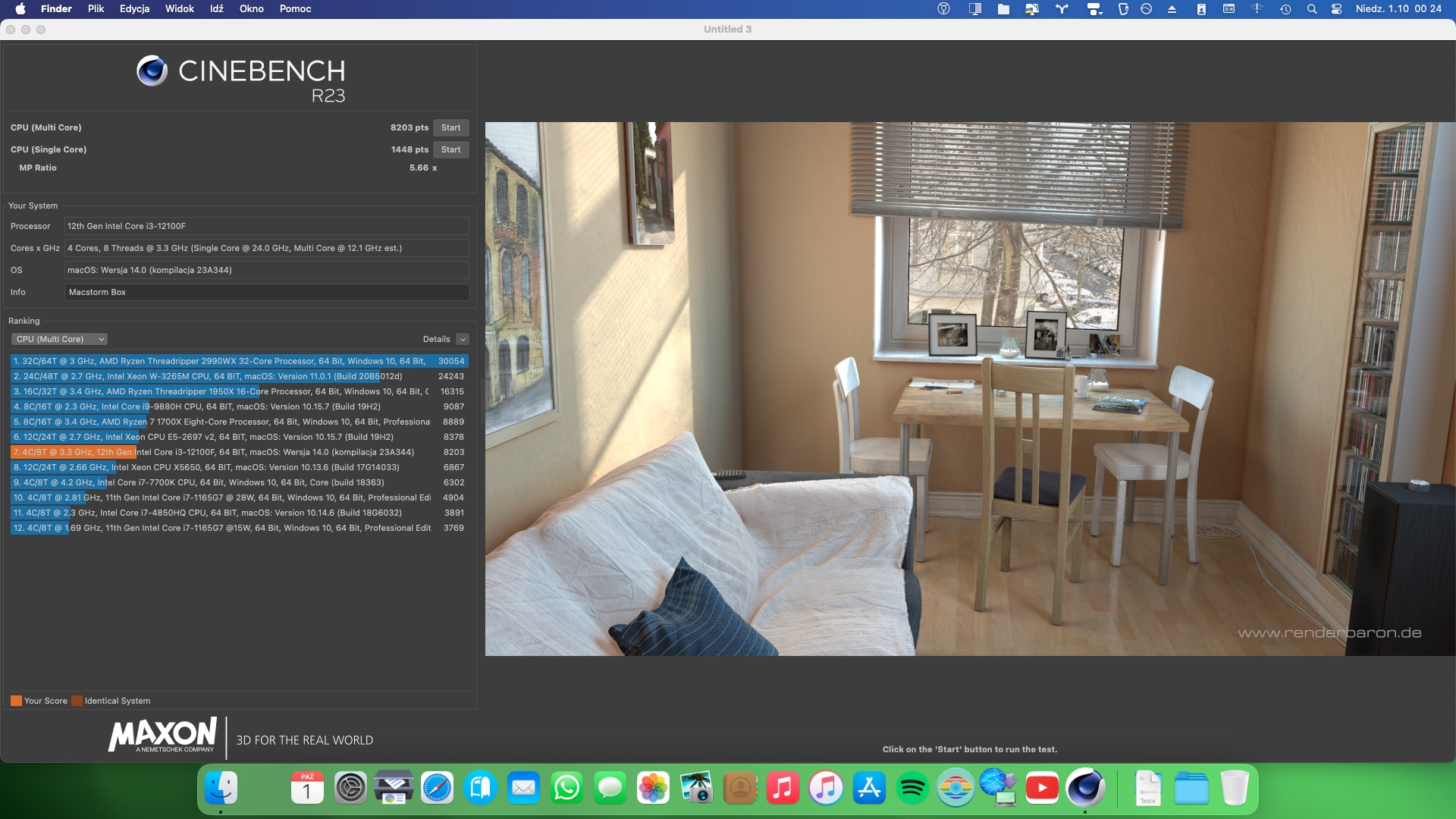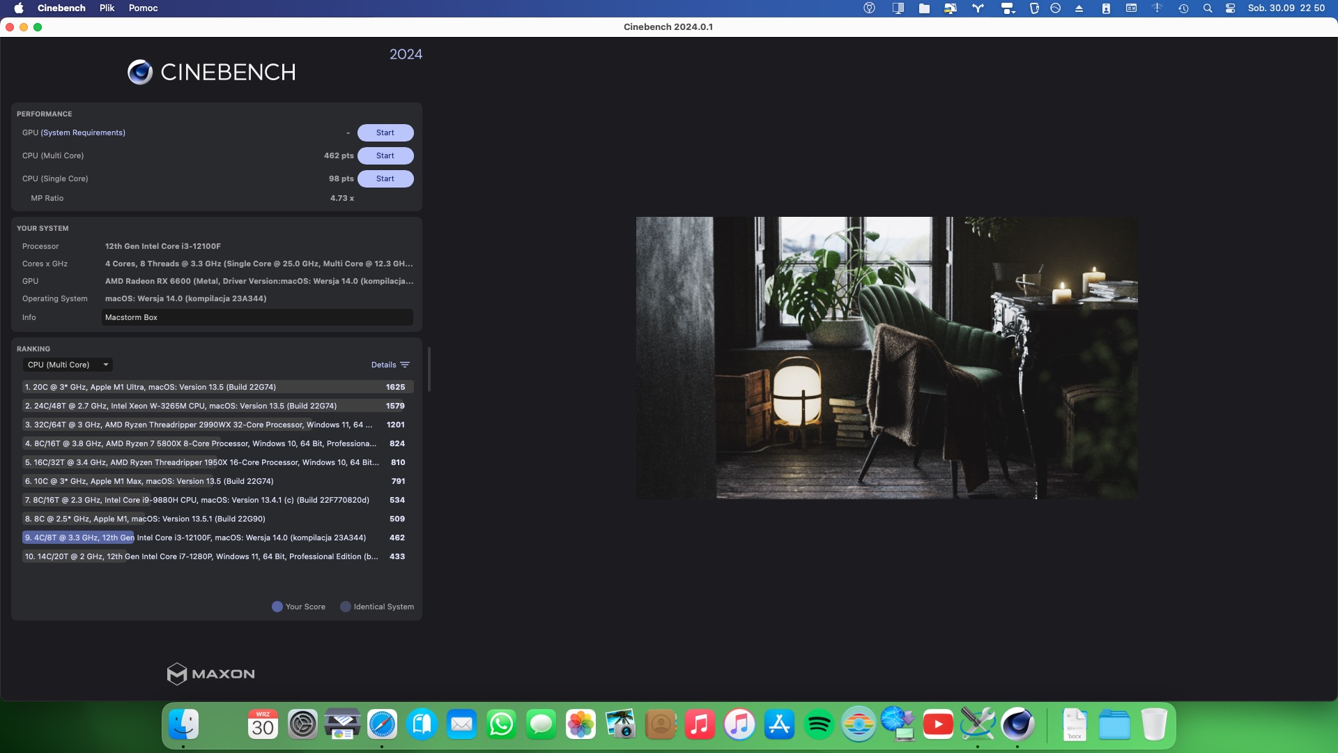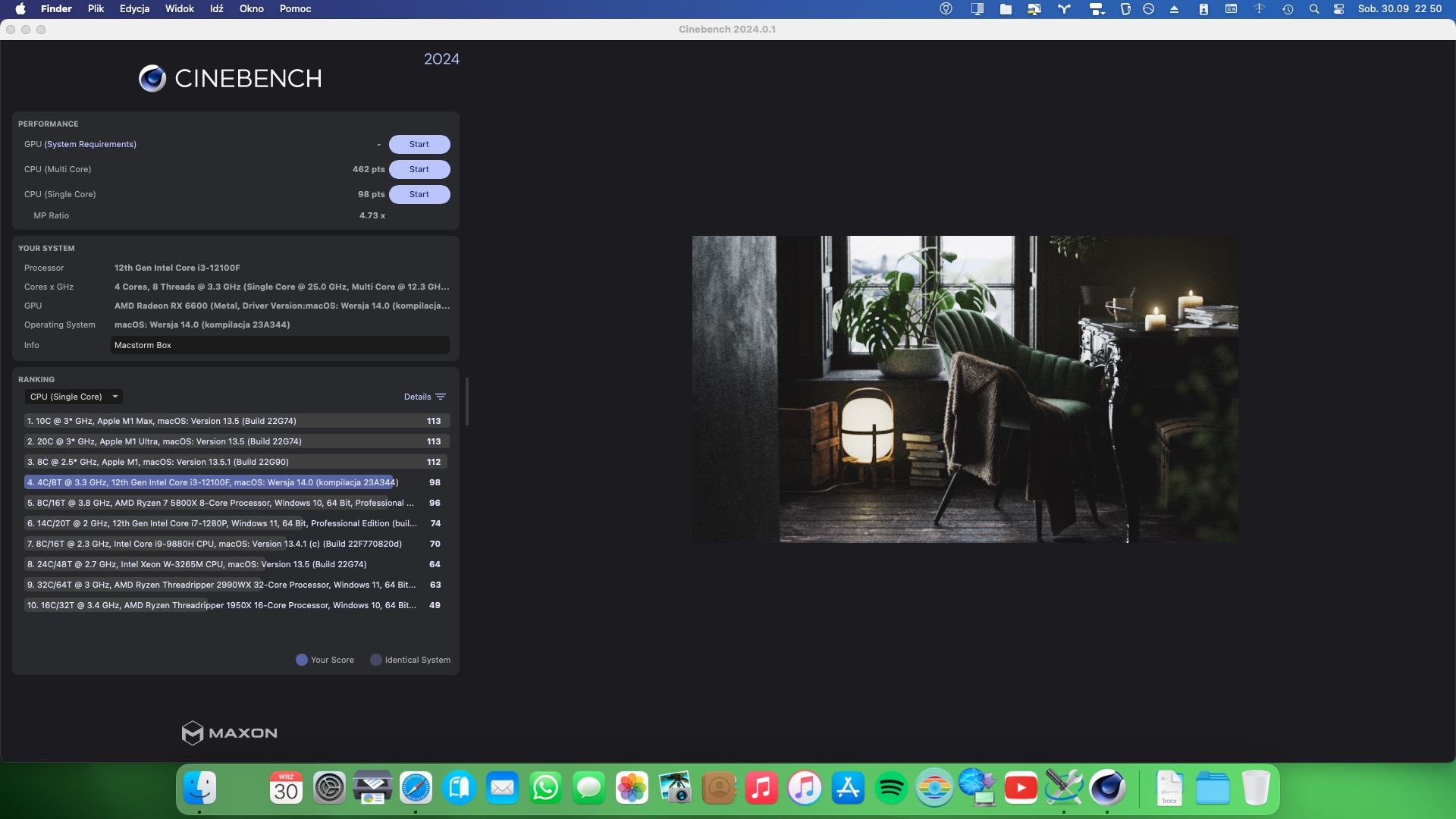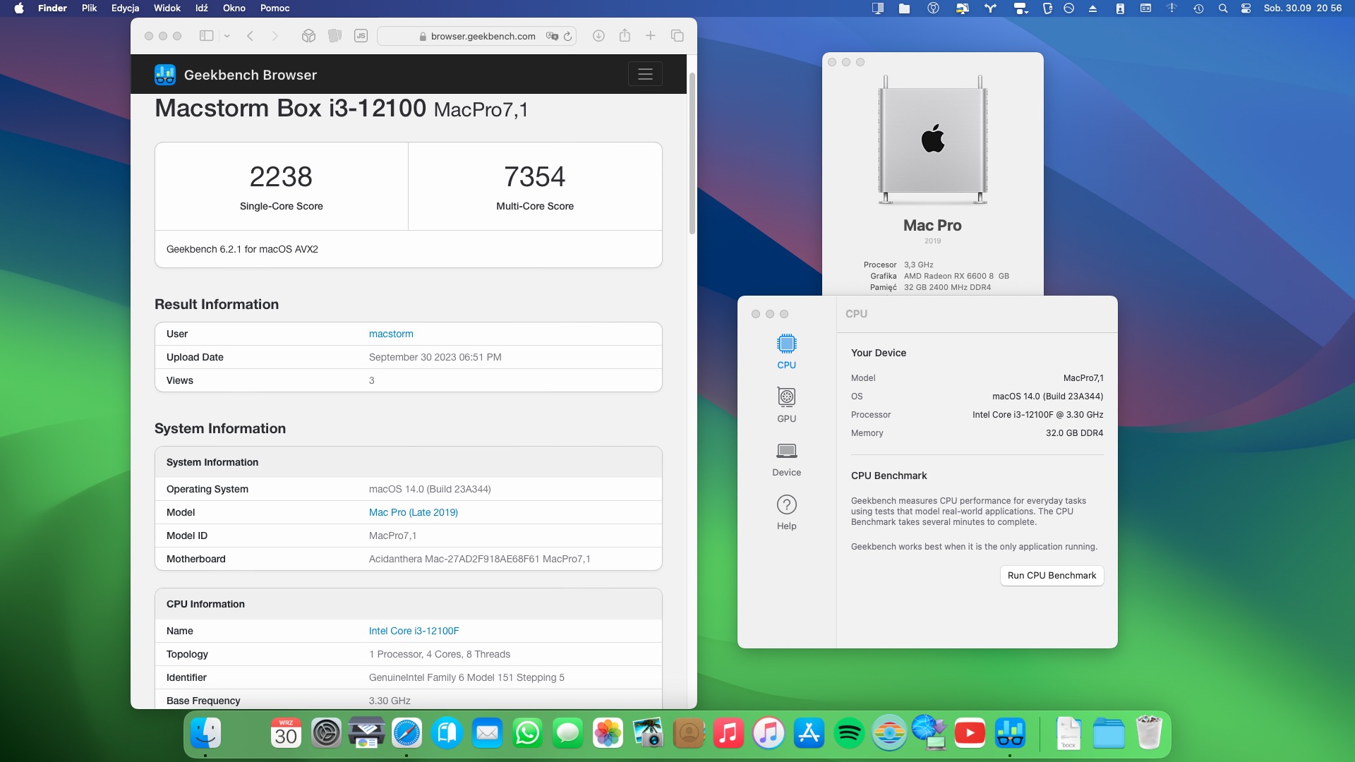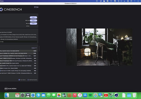macOS Sonoma 14.0 . Procesor Intel Core i3-12100 3.3 GHz .Pamięć 32 GB DDR4 2400 MHz.Karta graficzna Radeon RX 6600 8 GB.