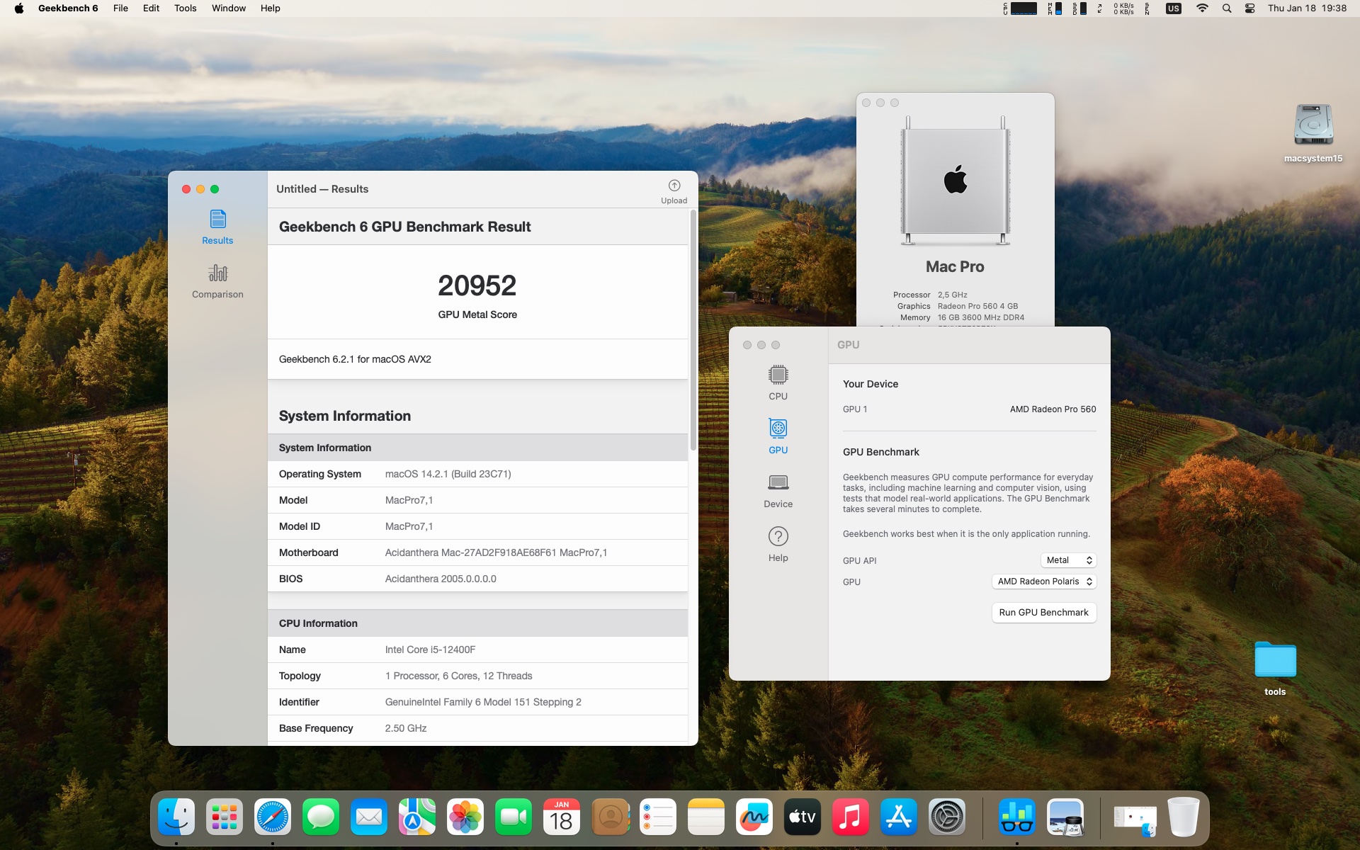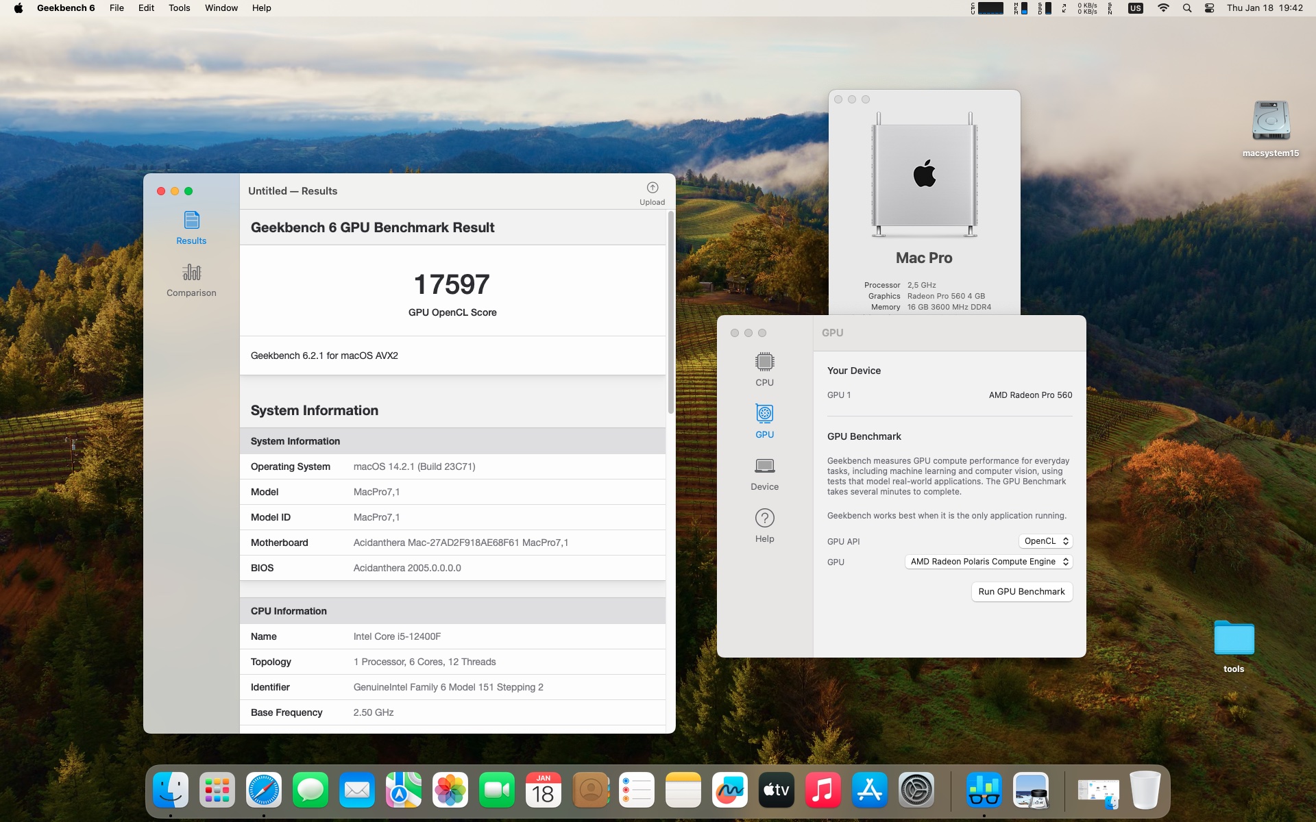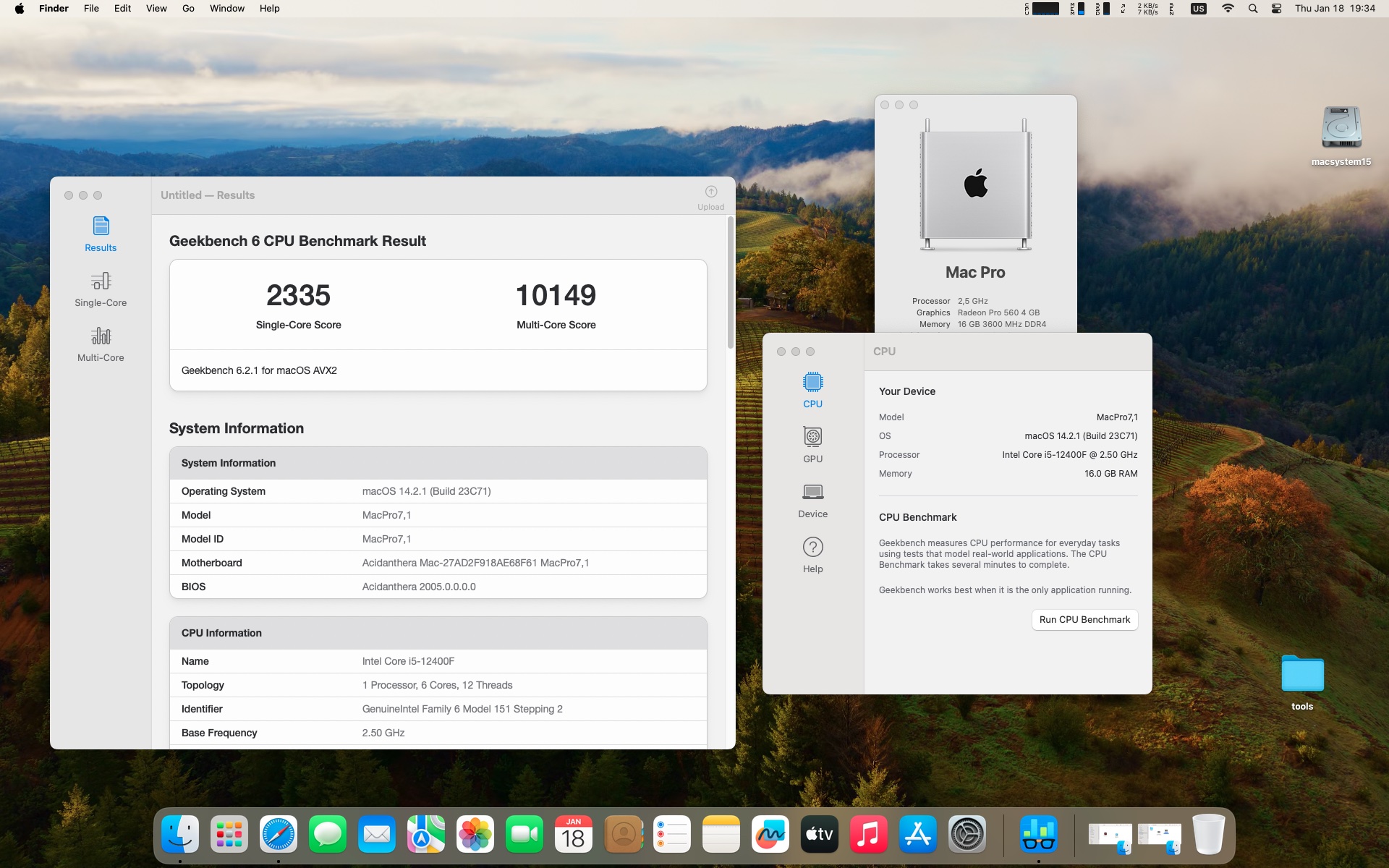 macOS Sonoma 14.2.1 . Procesor Intel Core i5-12400F .Karta graficzna Radeon RX 560 4 GB .Pamięć 16 GB DDR4 3600 MHz.
