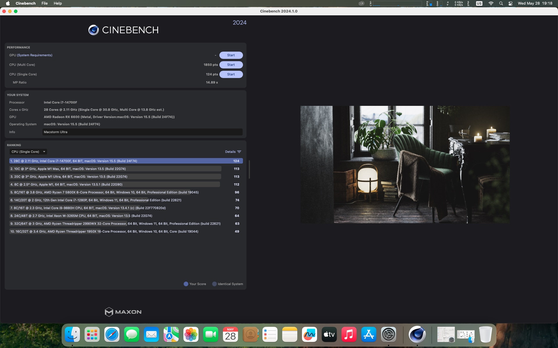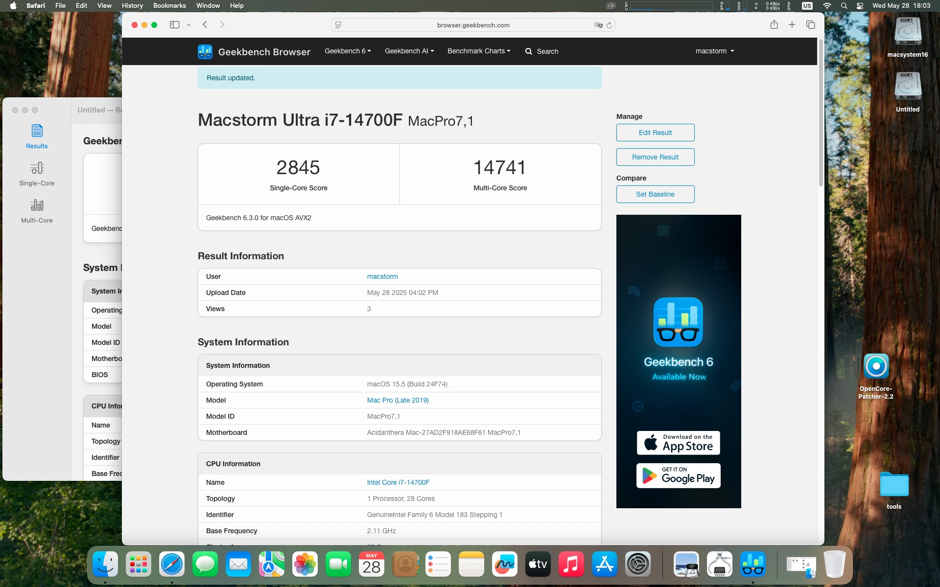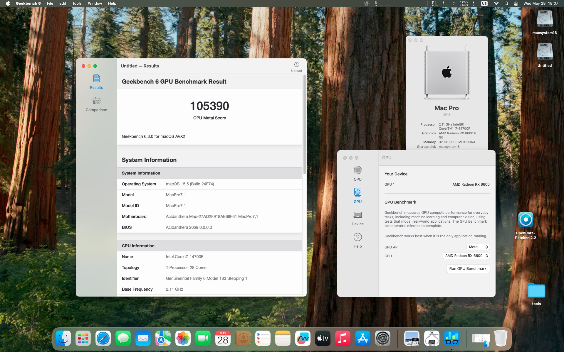macOS Sequoia 15.5 . Procesor Intel Core i7-14700F.Pamięć 32 GB DDR4 3600 MHz.Grafika Radeon RX 6600 8 GB.