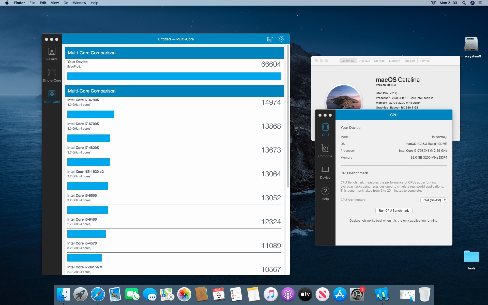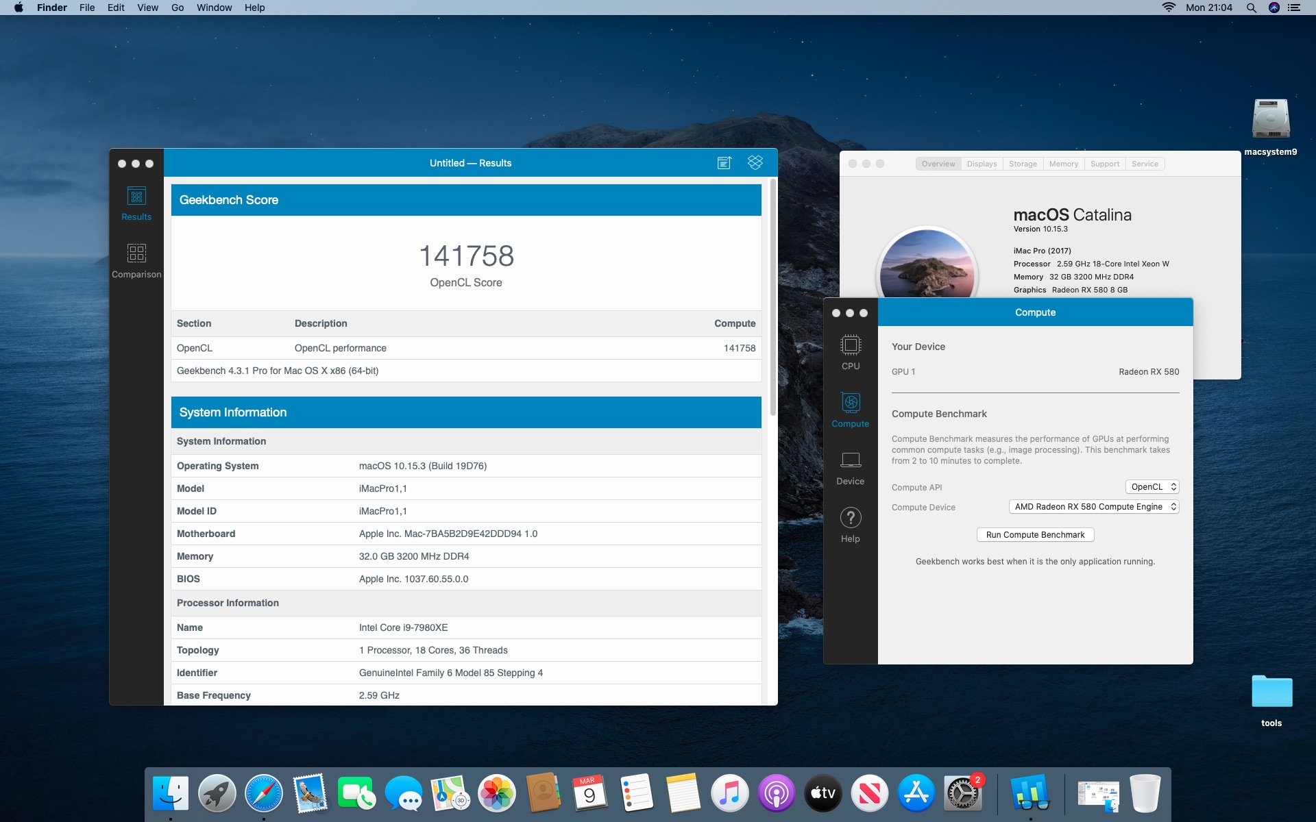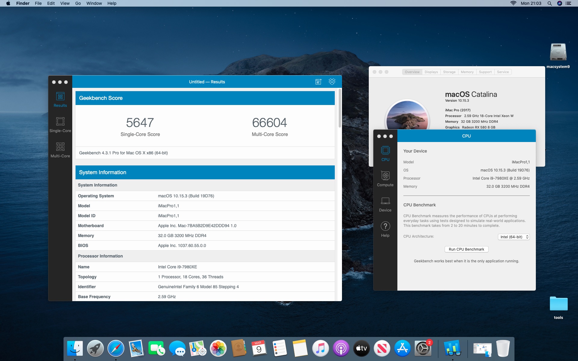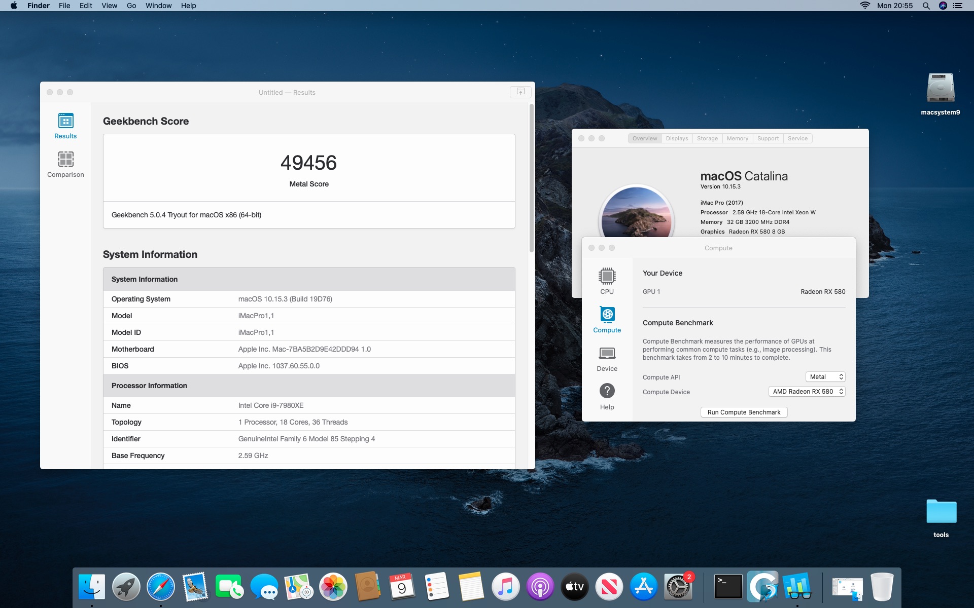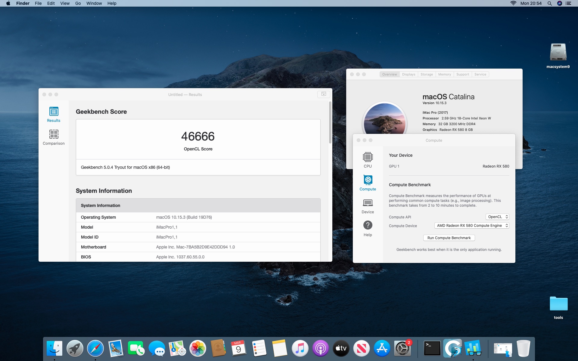 System MacOS Catalina 10.15.3. Procesor Intel i9-7980XE 2.6@4.5 GHz - 18 cores.Grafika Radeon RX 580 8 GB. Pamięć 32 GB DDR 4 3200 MHz.