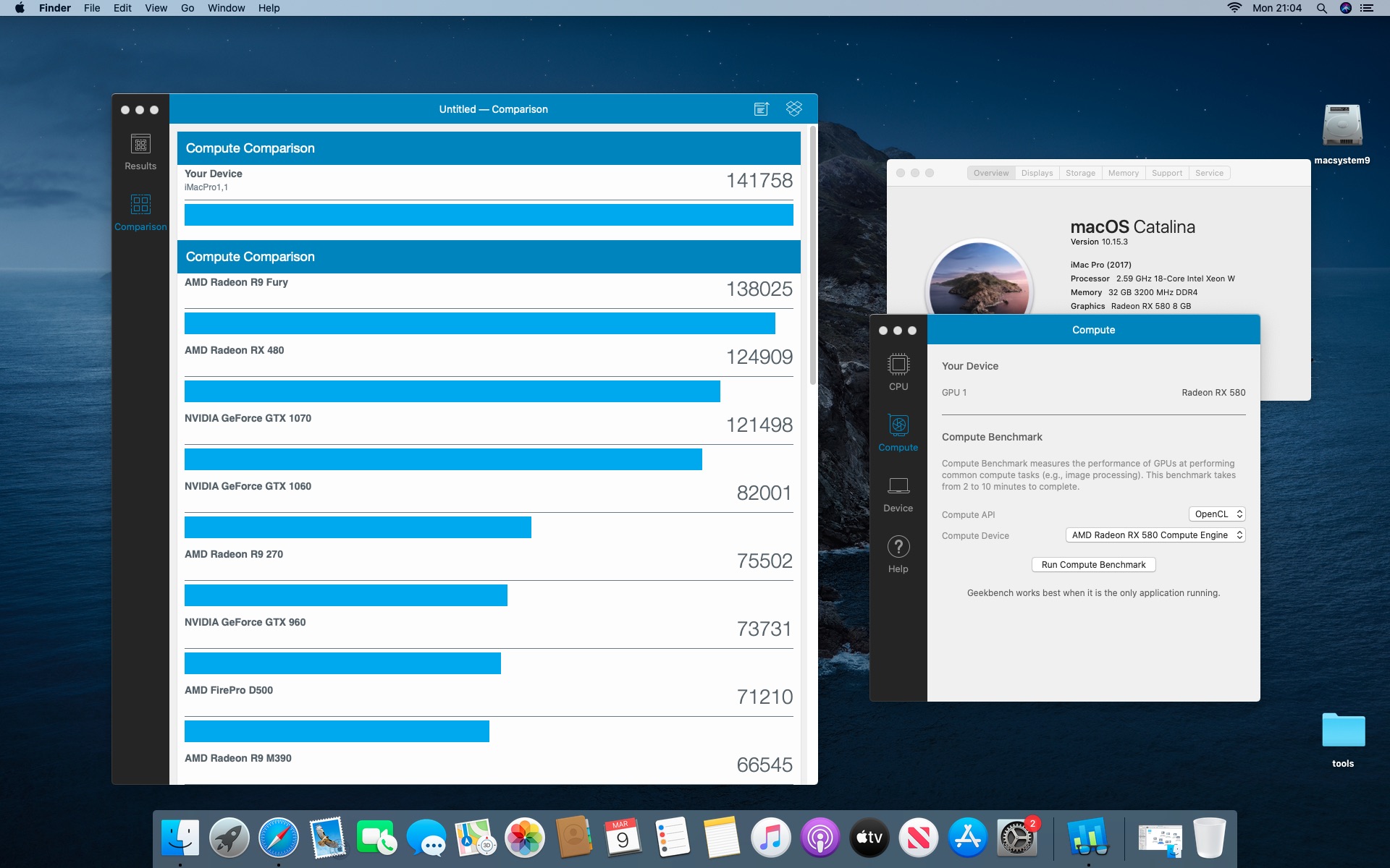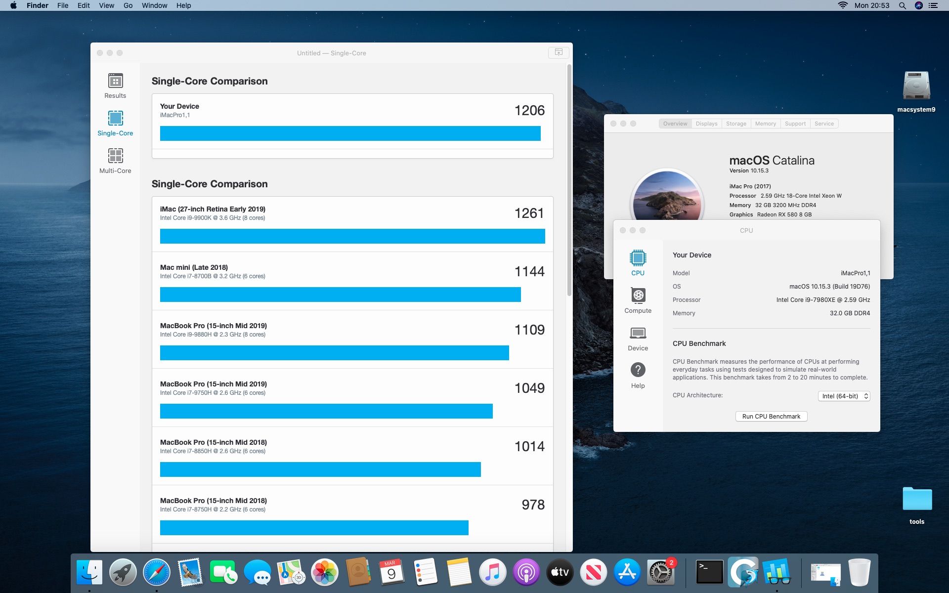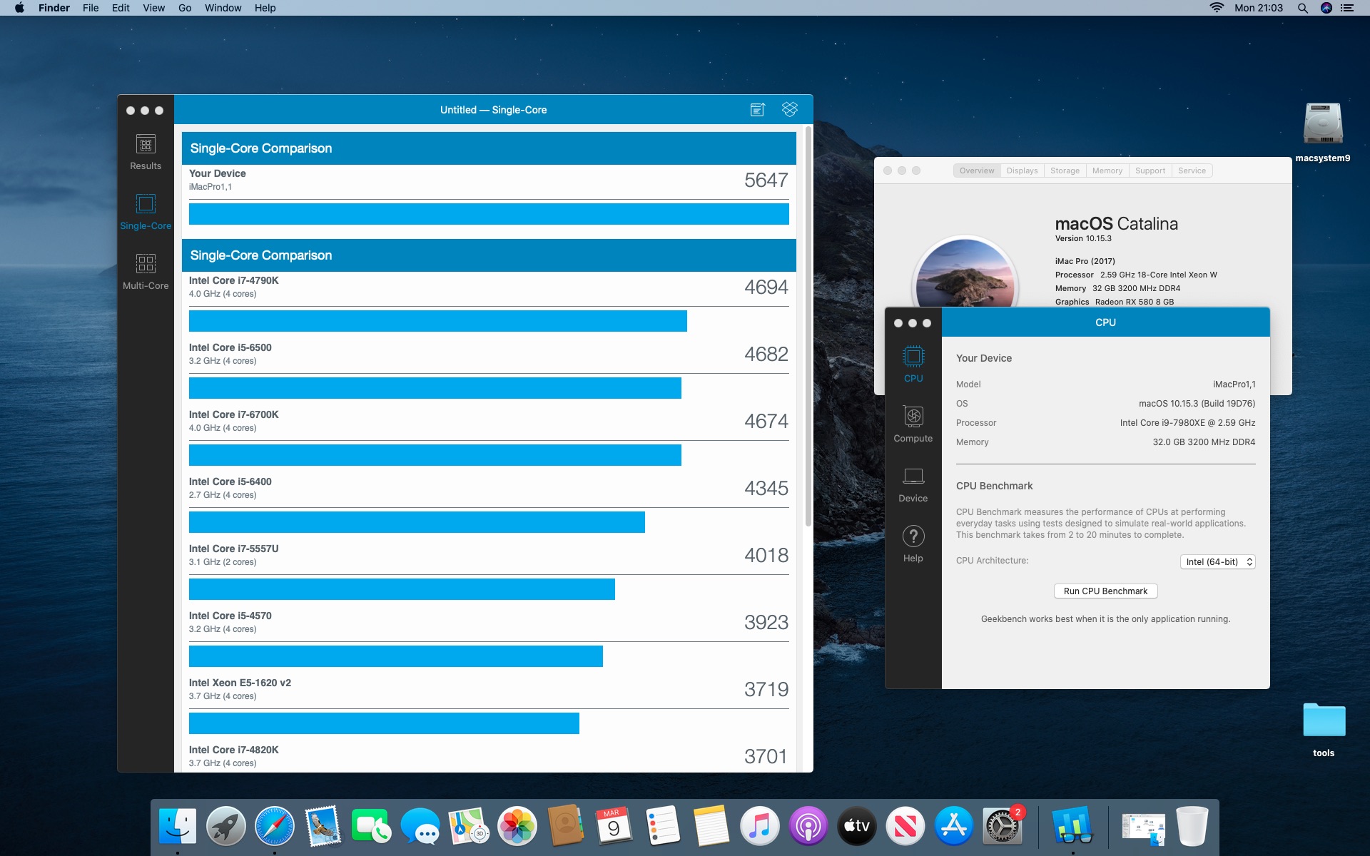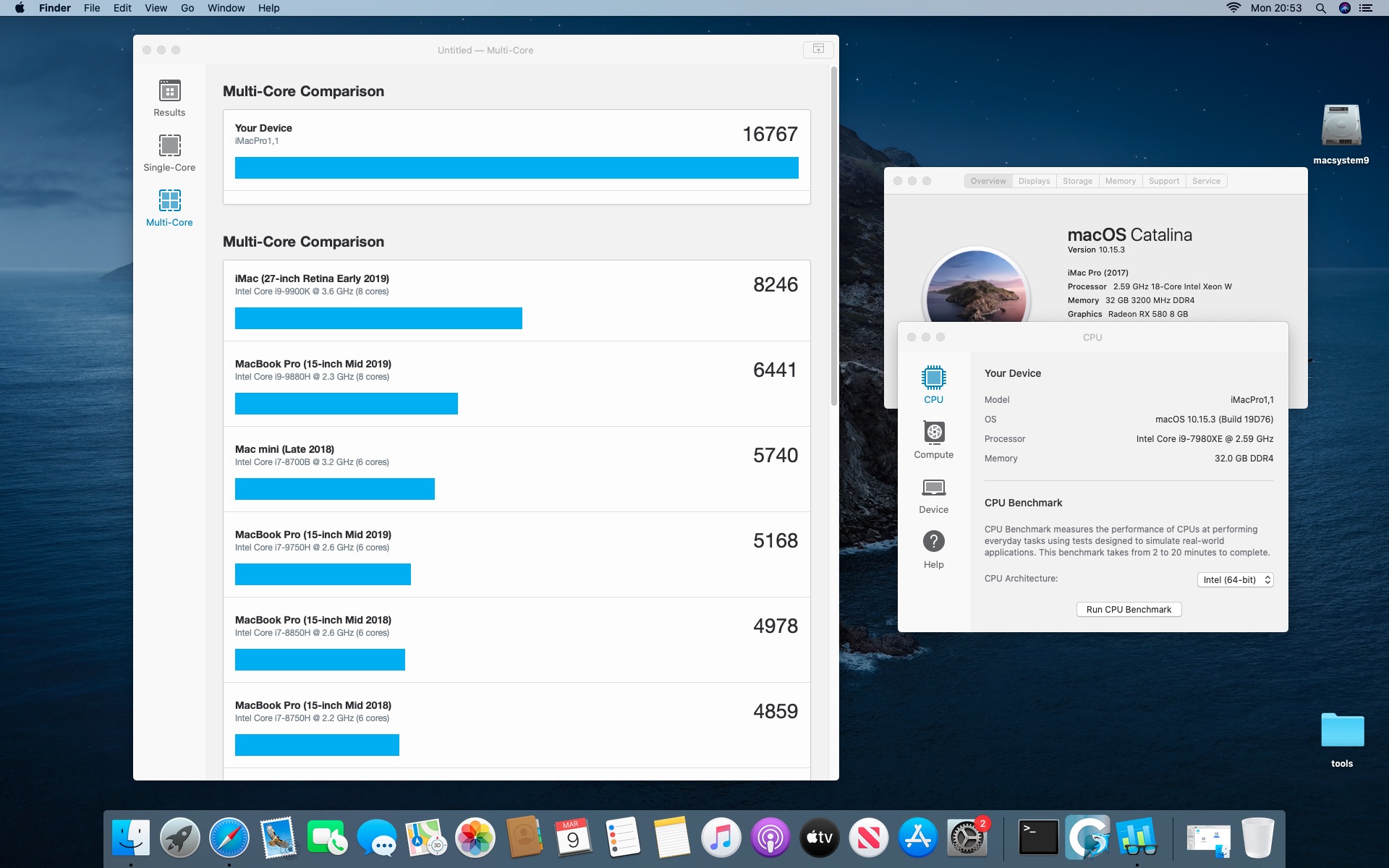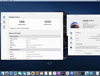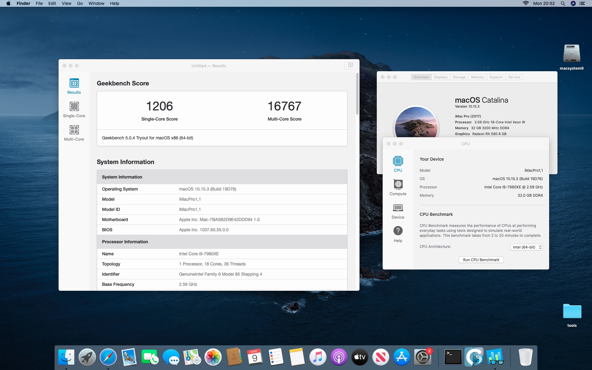 System MacOS Catalina 10.15.3. Procesor Intel i9-7980XE 2.6@4.5 GHz - 18 cores.Grafika Radeon RX 580 8 GB. Pamięć 32 GB DDR 4 3200 MHz.