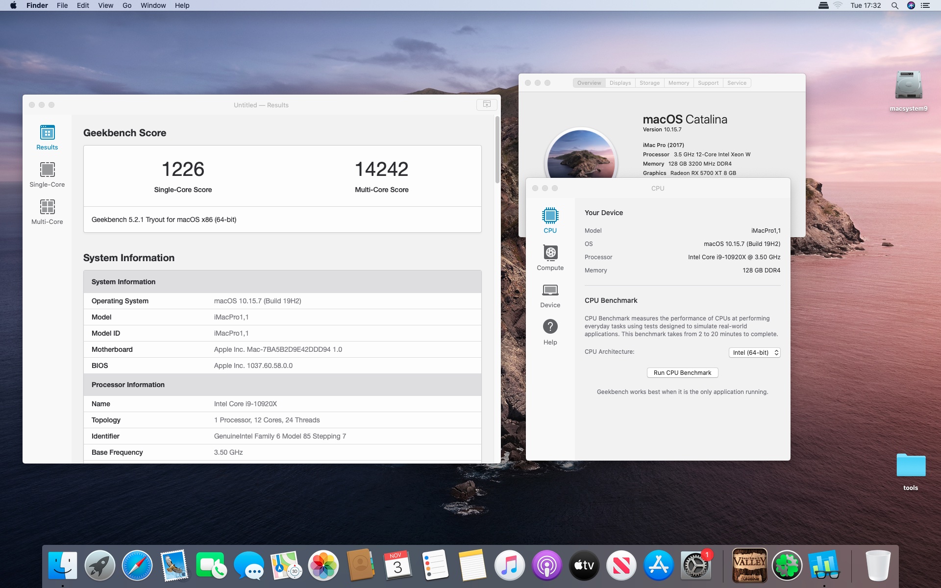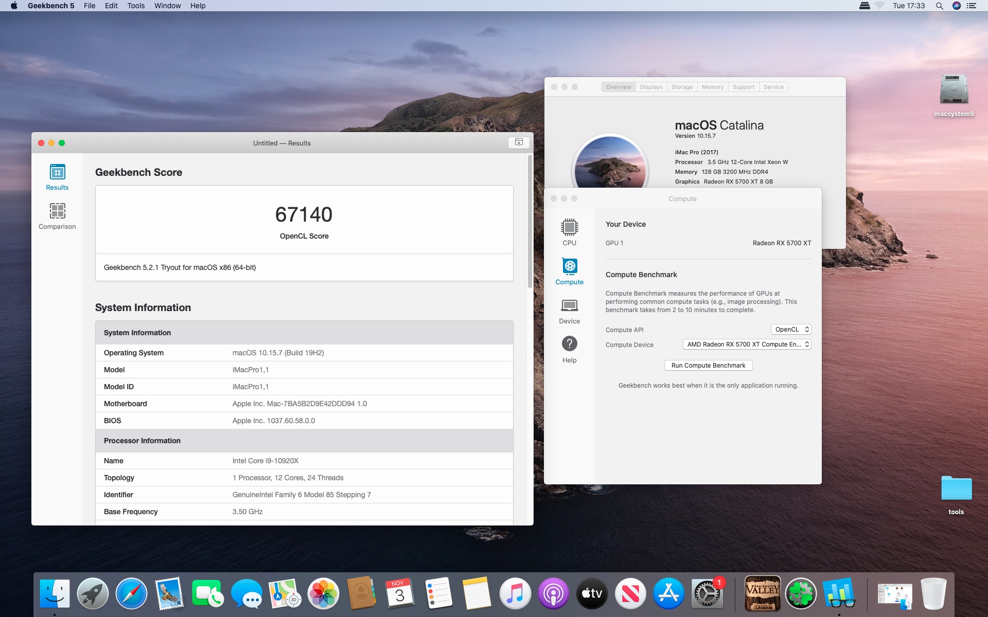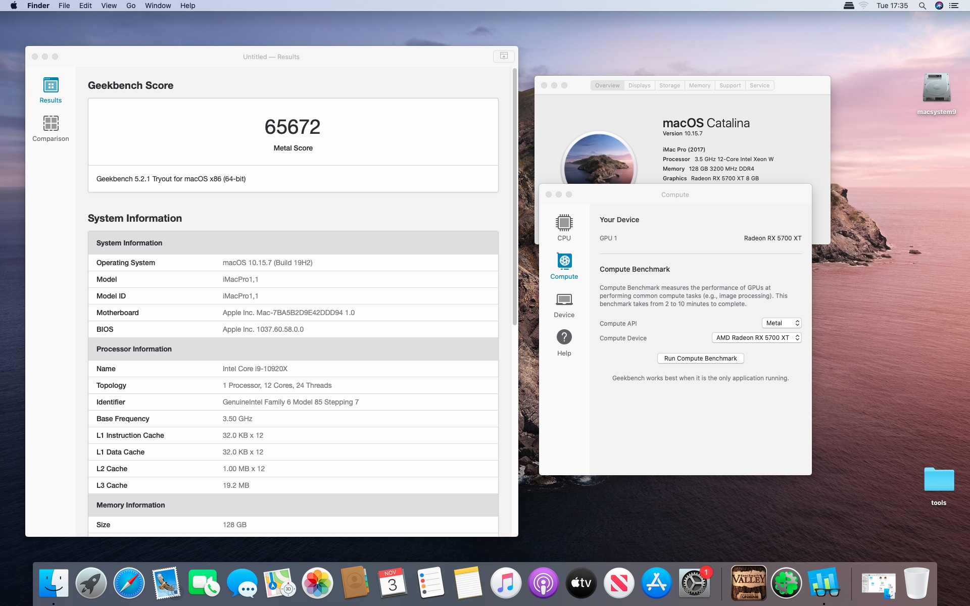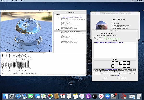 MacOs Catalina 10.15.7 . Procesor Intel core i9-10920X 3.5@4.8 GHzGrafika Radeon RX 5700 XT 8 GB. Pamięć 128 GB DDR4 3200.Dysk Samsung 970 Plus 2 TB.