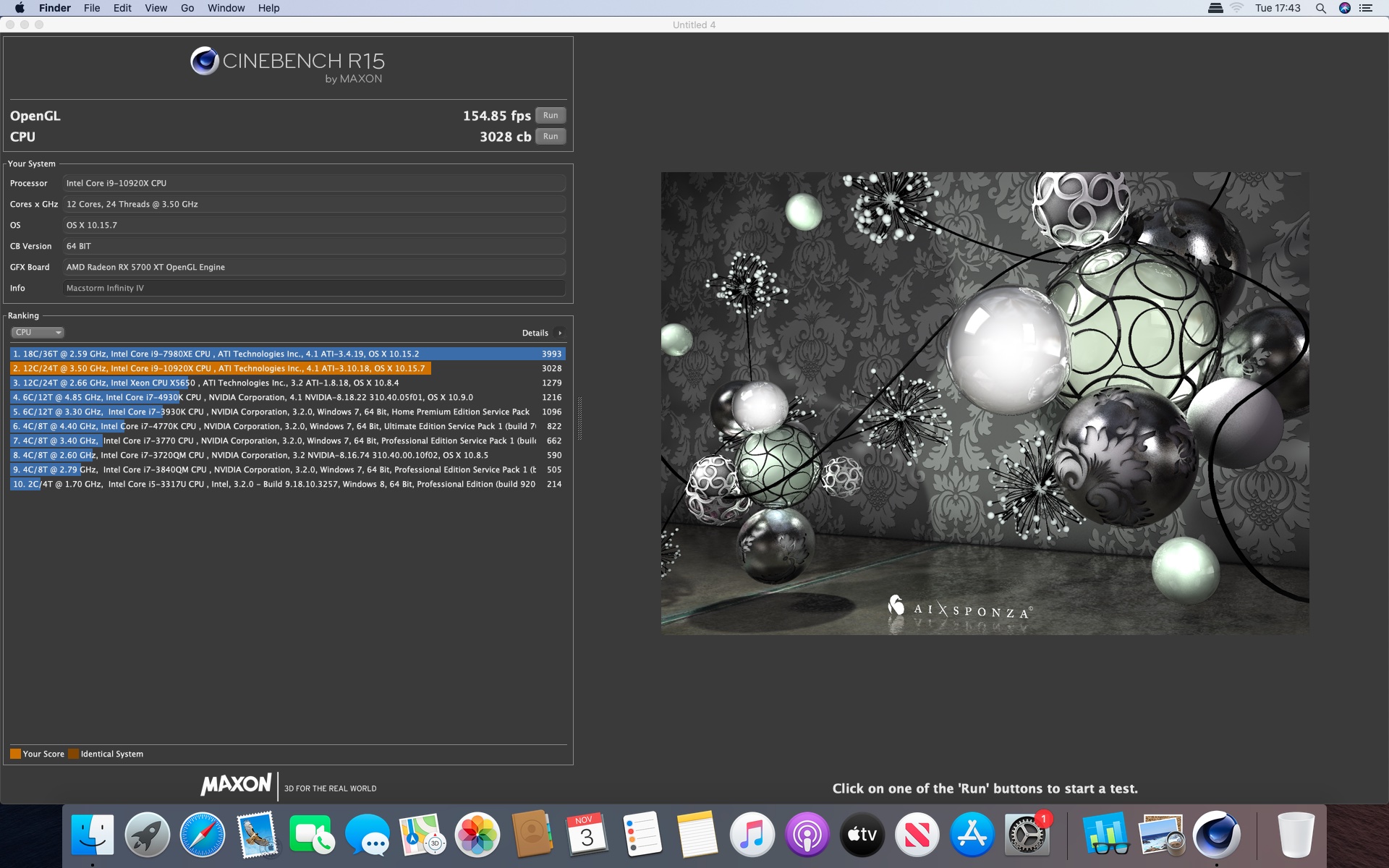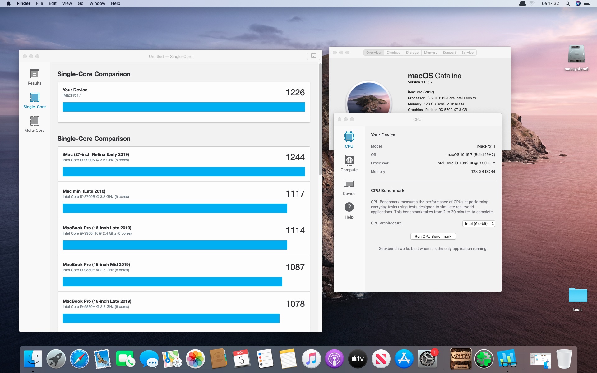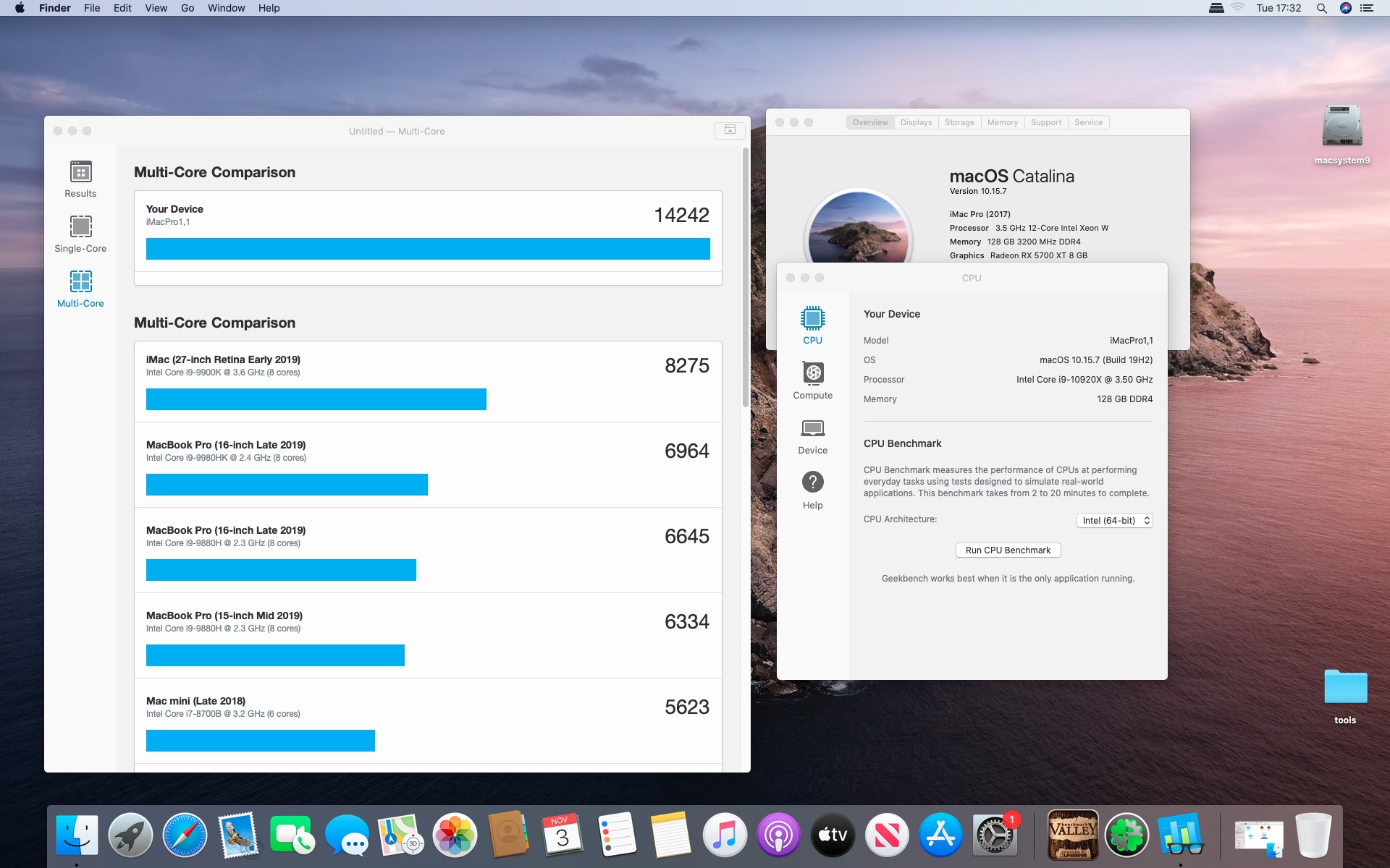 MacOs Catalina 10.15.7 . Procesor Intel core i9-10920X 3.5@4.8 GHzGrafika Radeon RX 5700 XT 8 GB. Pamięć 128 GB DDR4 3200.Dysk Samsung 970 Plus 2 TB.